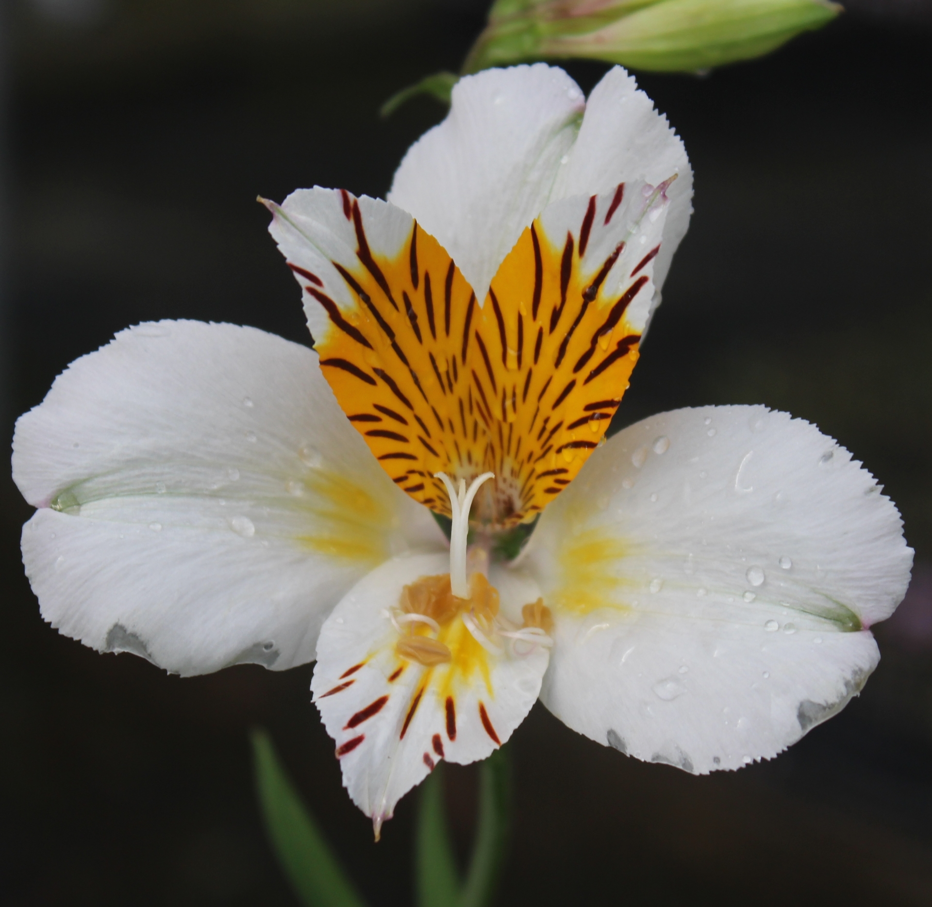 A true show-stopper with the largest flowers we've ever seen; 3-1/2" across! In comparison, most hybrids are 2-1/4 to 2-3/4" across. The flowers are close to pure white with a large, deep gold zone and the obligate brown dashes. Stems are exceptionally sturdy and upright. Please note 'Apollo' doesn't like to be in pots in hot areas, as we have lost them in the greenhouses in 4" pots during hot summers. BEFORE ORDERING, PLEASE read very important information about growing and shipping Alstroemerias on top of the Alstroemeria main page.