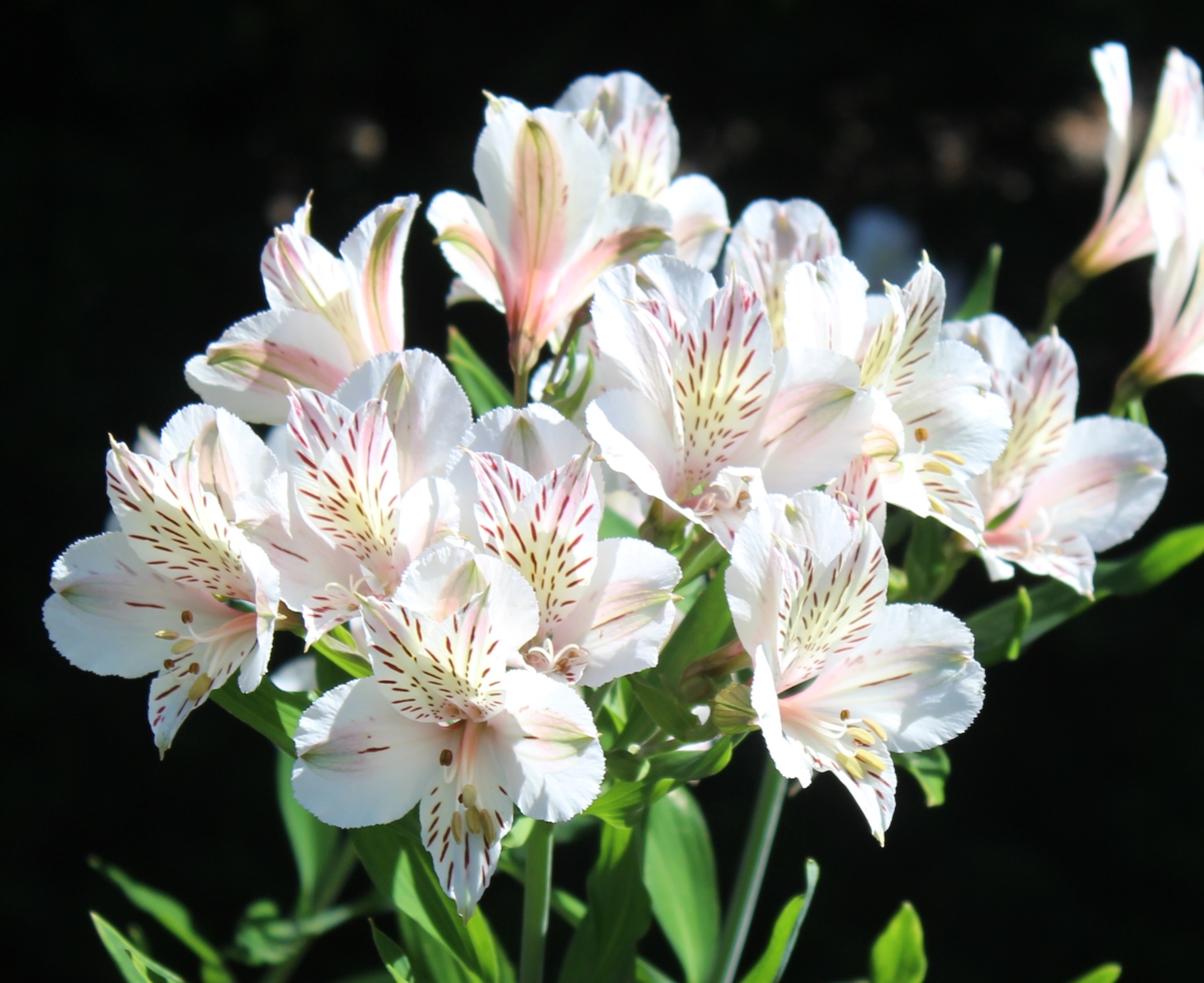 The whitest thus far, just a little tinted with pink and yellow, besides the obligatory burgundy dashes. Often extremes like being the whitest make selections weak or a fussy grower; not 'Casablanca'! A strong grower (but not spreading) and heavy bloomer on sturdy stems. BEFORE ORDERING, PLEASE read very important information about growing and shipping Alstroemerias on top of the Alstroemeria main page.