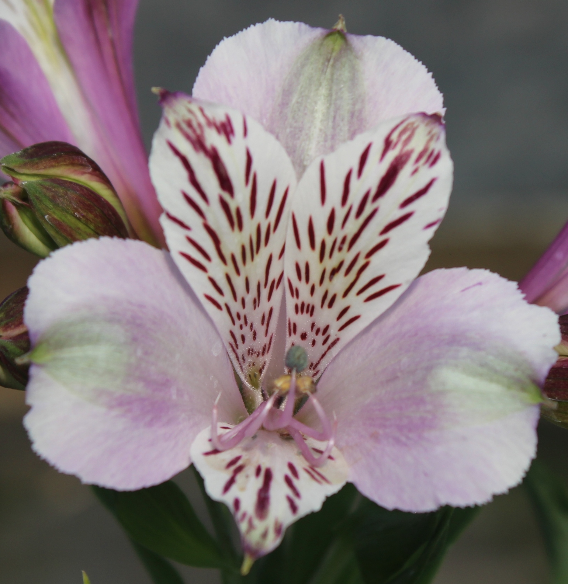 Medium sized (2 1/4") flowers but top of the line quality: the rounded outer petals are soft lavender, highlighted with small green eyes at the tips. The inner petals are almost white and heavily dashed purple. Overall the flowers have a round and sophisticated appearance, helped by the darker buds and outsides. BEFORE ORDERING, PLEASE read very important information about growing and shipping Alstroemerias on top of the Alstroemeria main page.