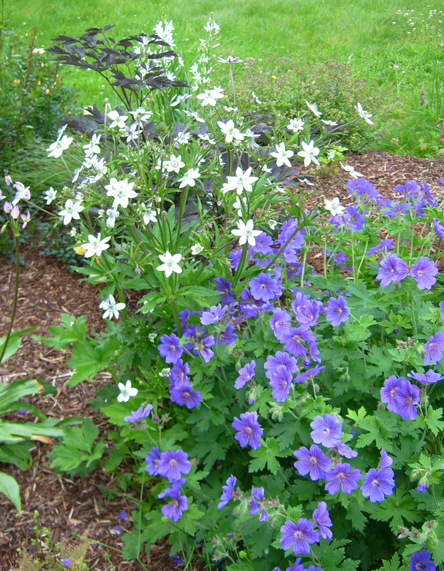 Loose umbels of 10-20 white flowers, 1-2" across each, blue-purple on the reverse and prominent blue anthers. Prefers a moist soil, especially in sun.