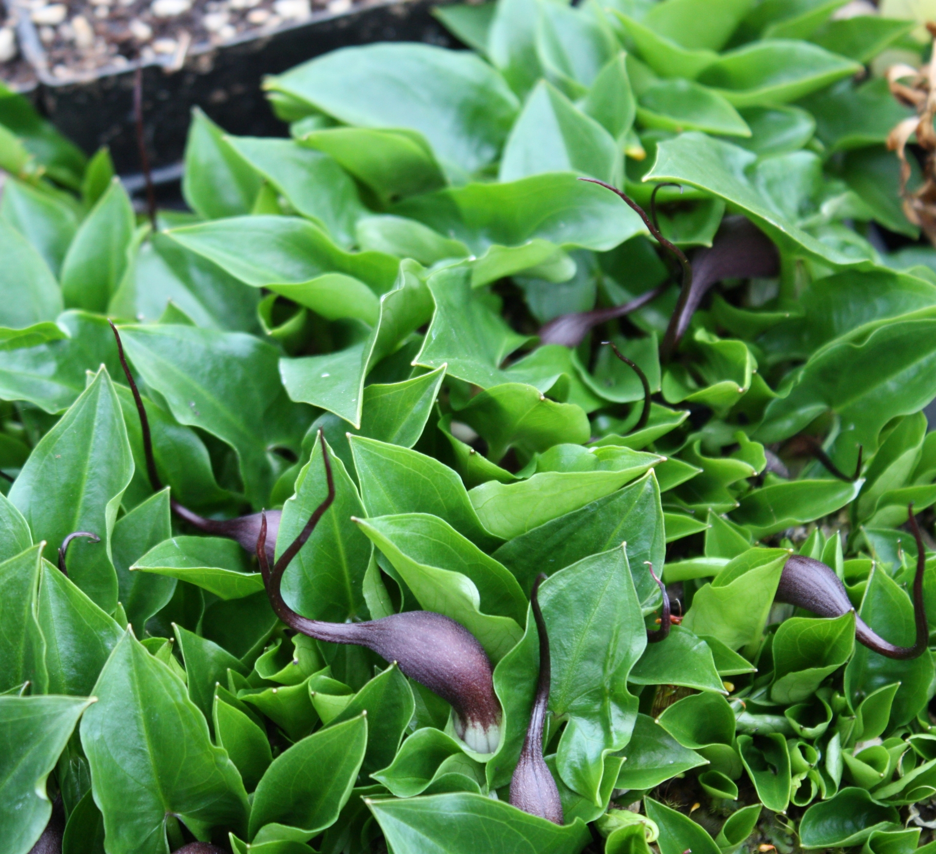 - (Please note: these have been potted late fall but will not be rooted-in until late spring. Plant as is - preferrably on a cooler day; they'll never know what hit 'em). - A curiosity for sure, several inches long purple spadix (mouse tails) sticking out of glossy, arrow-shaped foliage, the rest of flower is hidden. Spreading by rhizomes, it is great filler around clumping plants that are in seaon summer and fall, like Epimedium, Hosta, Heuchera, shrubs, etc., etc. Likes humusy soil; moist in spring - drought tolerant in summer when the plant is dormant.