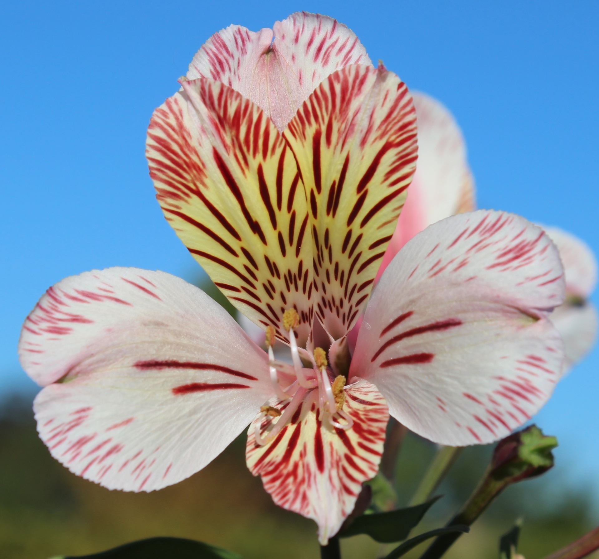 A taller selection with a very distinctive coloring: pale pink/cream base color, marked with prominent maroon colored stripes and dashes, highlighted by a light yellow throat. This is one of 24 we acquired from England in 2016 that have taken the heat and the cold (teens) here in Oregon. BEFORE ORDERING, PLEASE read very important information about growing and shipping Alstroemerias on top of the Alstroemeria main page.
