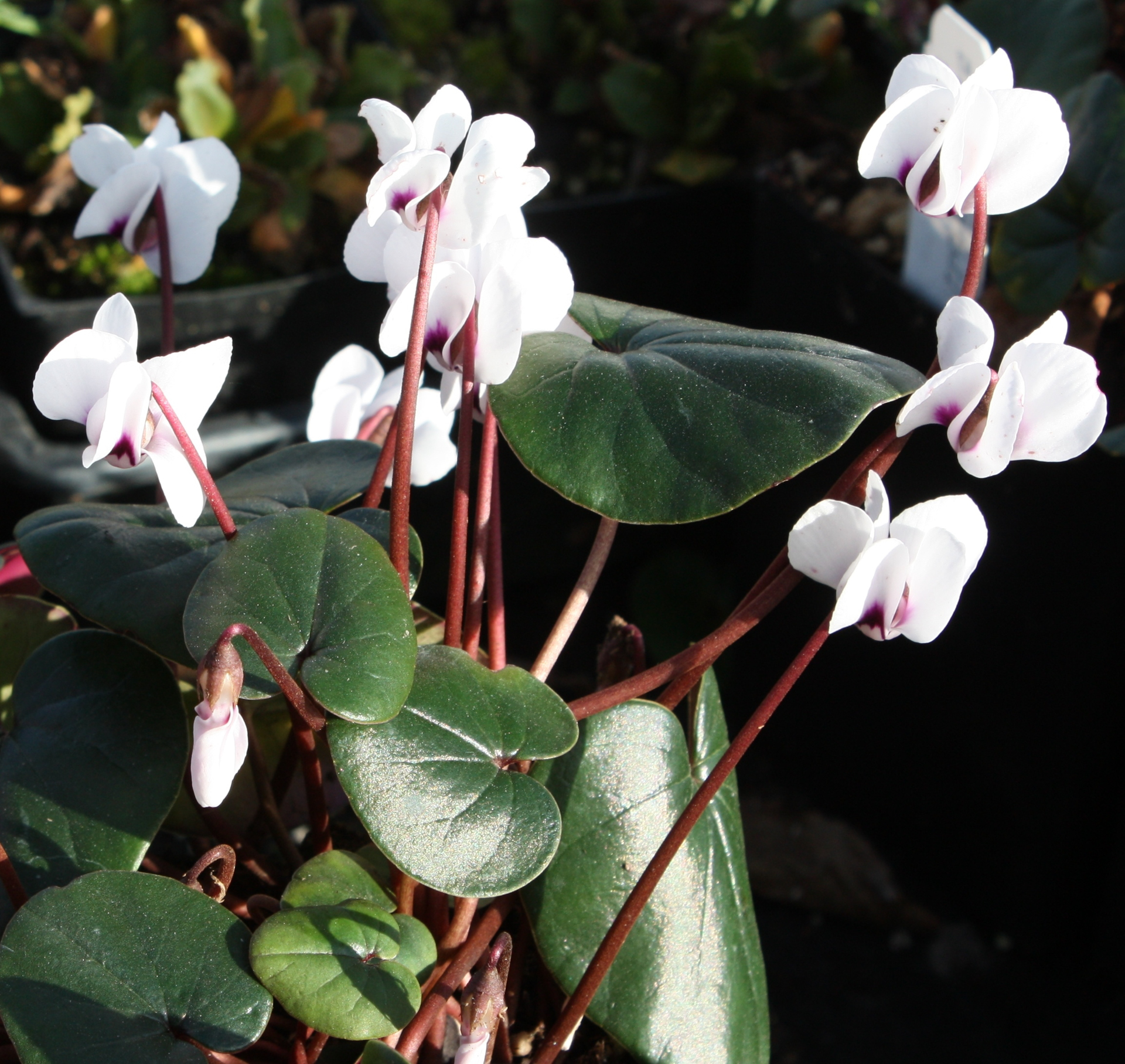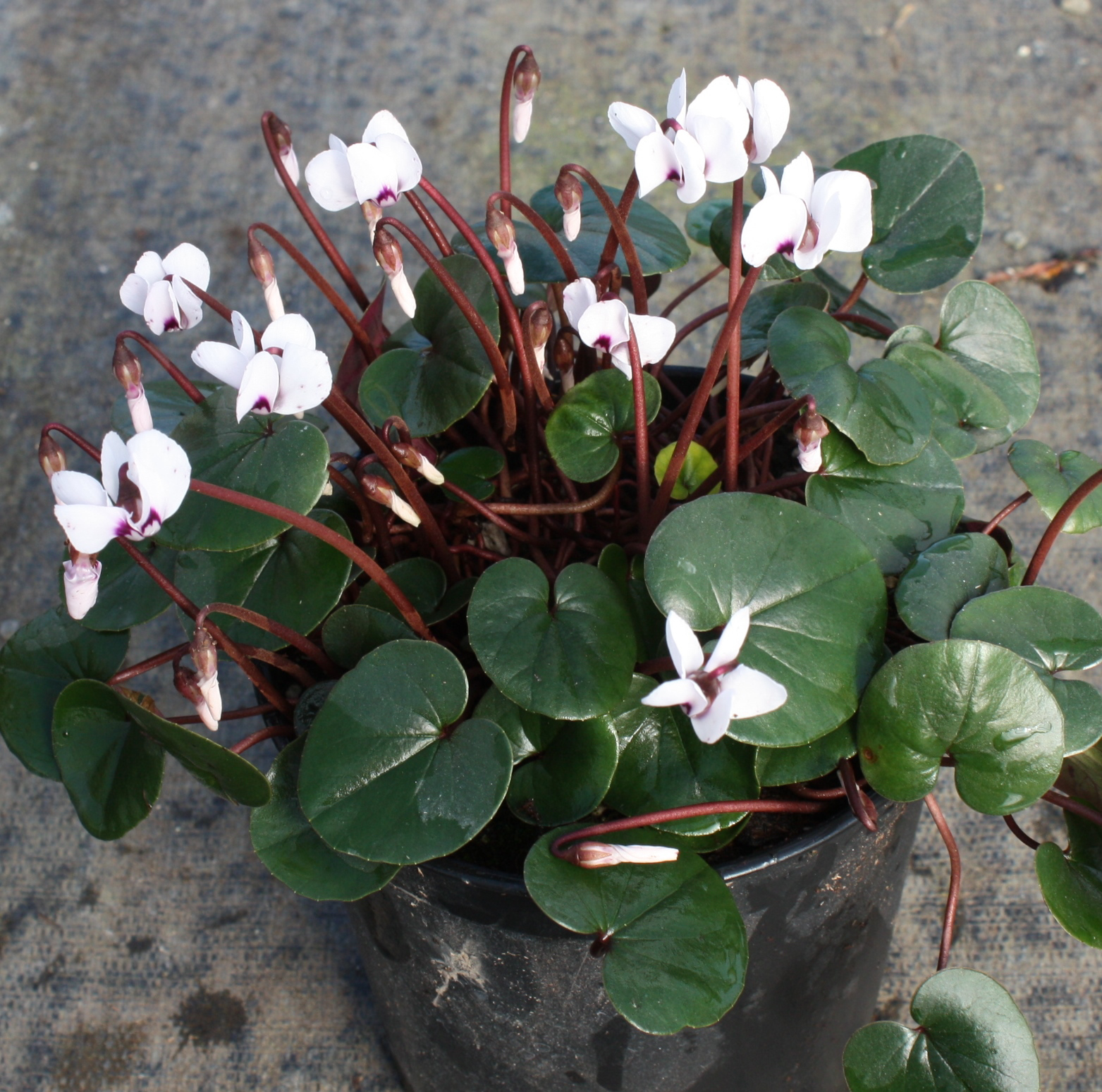 One of my favorites for great contrast, this selection has dark green leaves. White flowers, consisting of 5 reflexed, twisted petals, usually with a pink base. Leaves appear from fall thru spring. Great for planting under trees and shrubs. Well drained soil. 2 3/8" square - 3 3/4" deep pots.