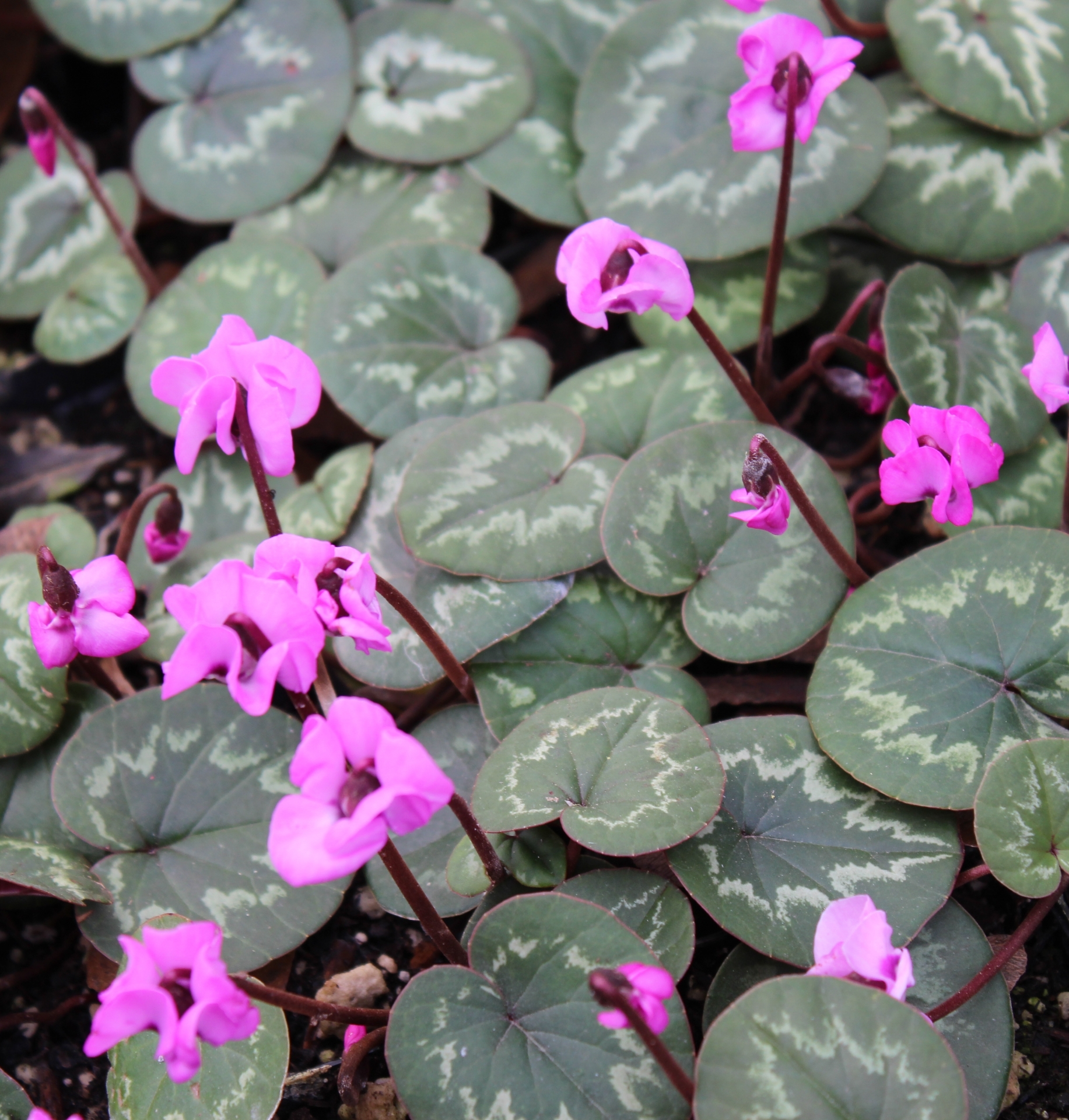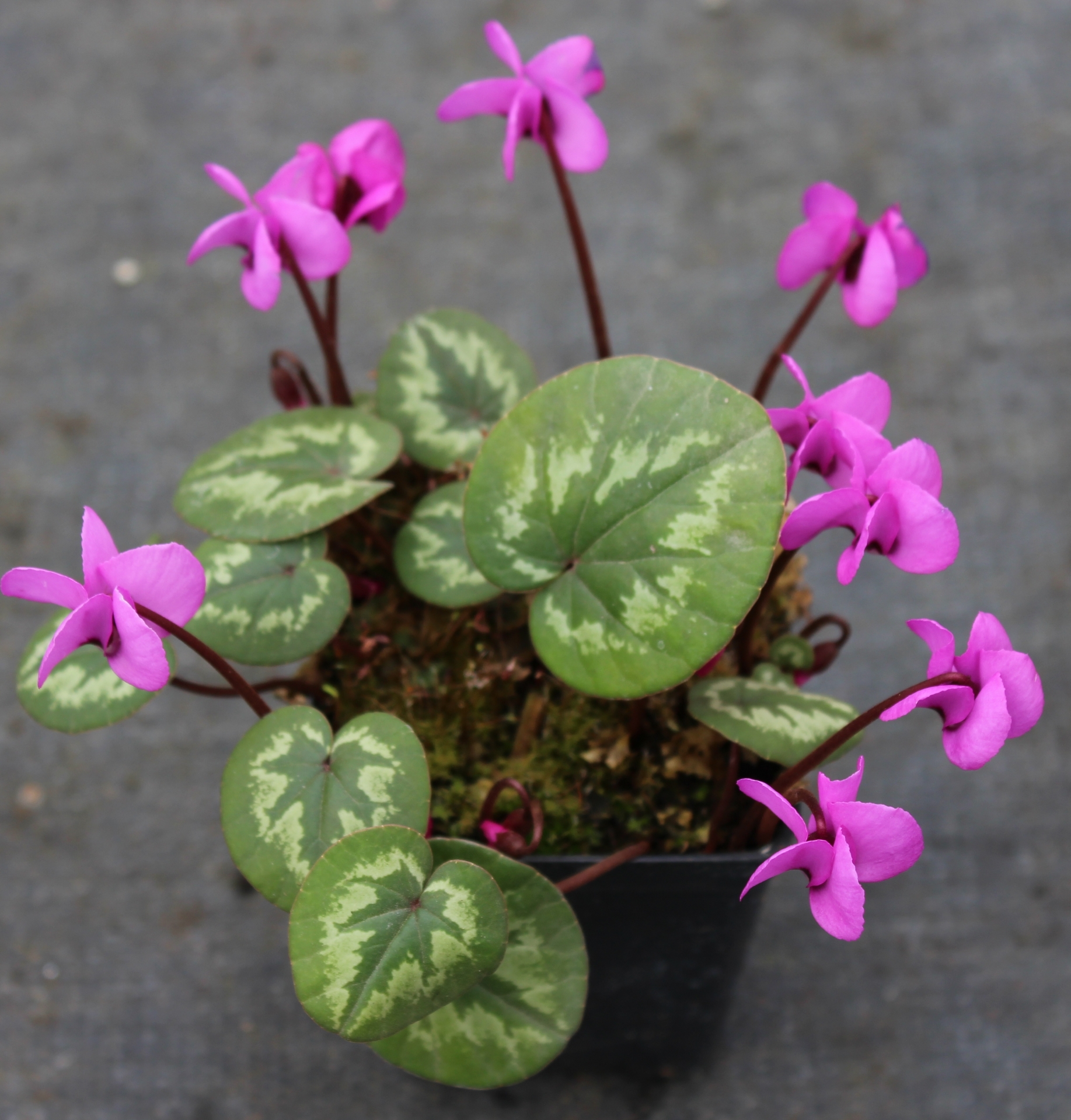 This group has a distinctive ivy-leaf shaped marking on dark green background, which make for great contrast, yet more subtle than "Christmas Tree", if you prefer. The leaves appear from fall thru springPink flowers, consisting of 5 reflexed, twisted petals. Great for planting under trees and shrubs. Well drained soil. Summer dormant. 2 3/8" square - 3 3/4" deep pots.