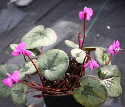 These group consists of plants that didn't quite make the cut for the Christmas Tree group but are nevertheless exceptional. Pink flowers, consisting of 5 reflexed, twisted petals. Very decorative leaves, dark green with a silver pattern, appearing from fall thru spring. Great for planting under trees and shrubs. Well drained soil. Summer dormant. 2 3/8" square - 3 3/4" deep pots.
