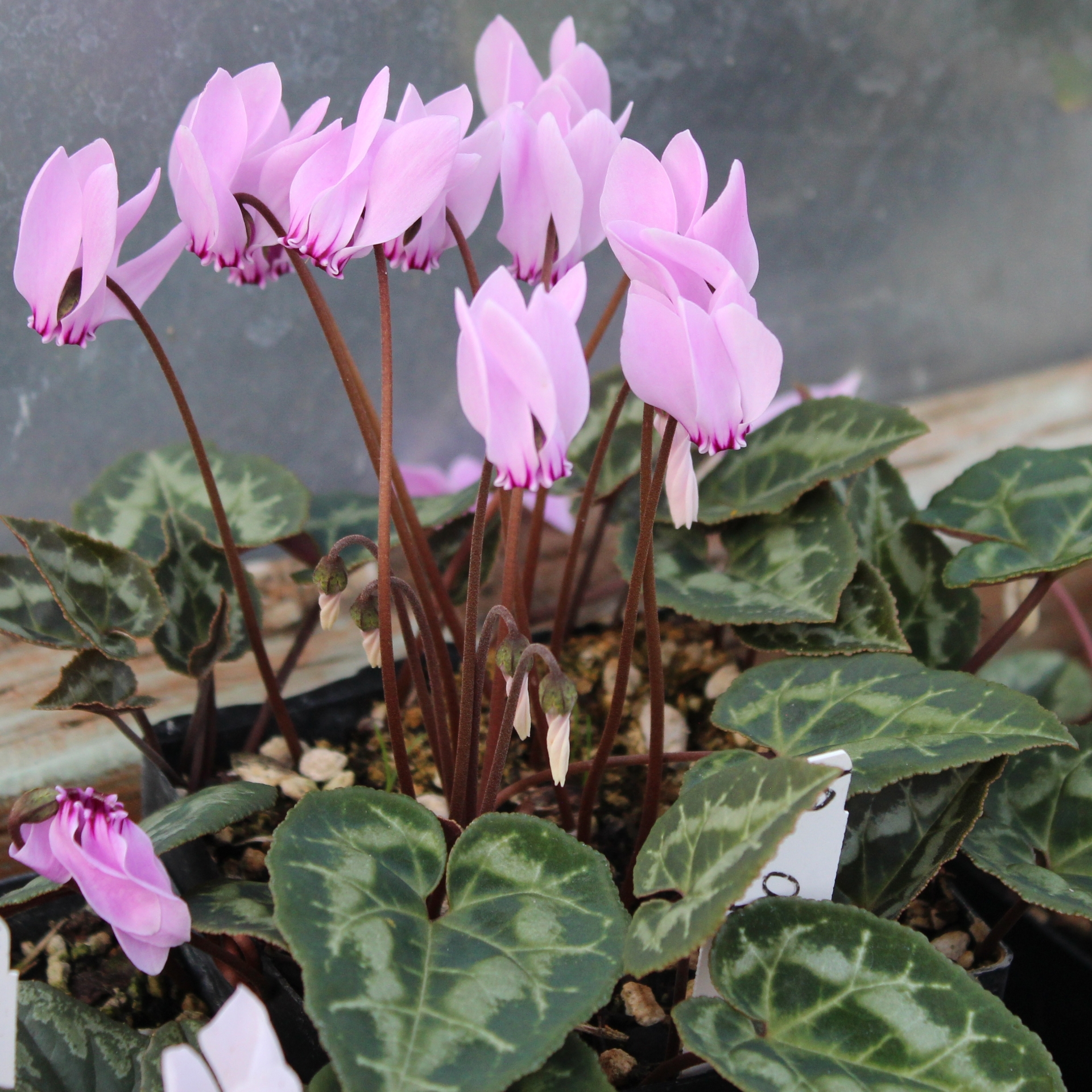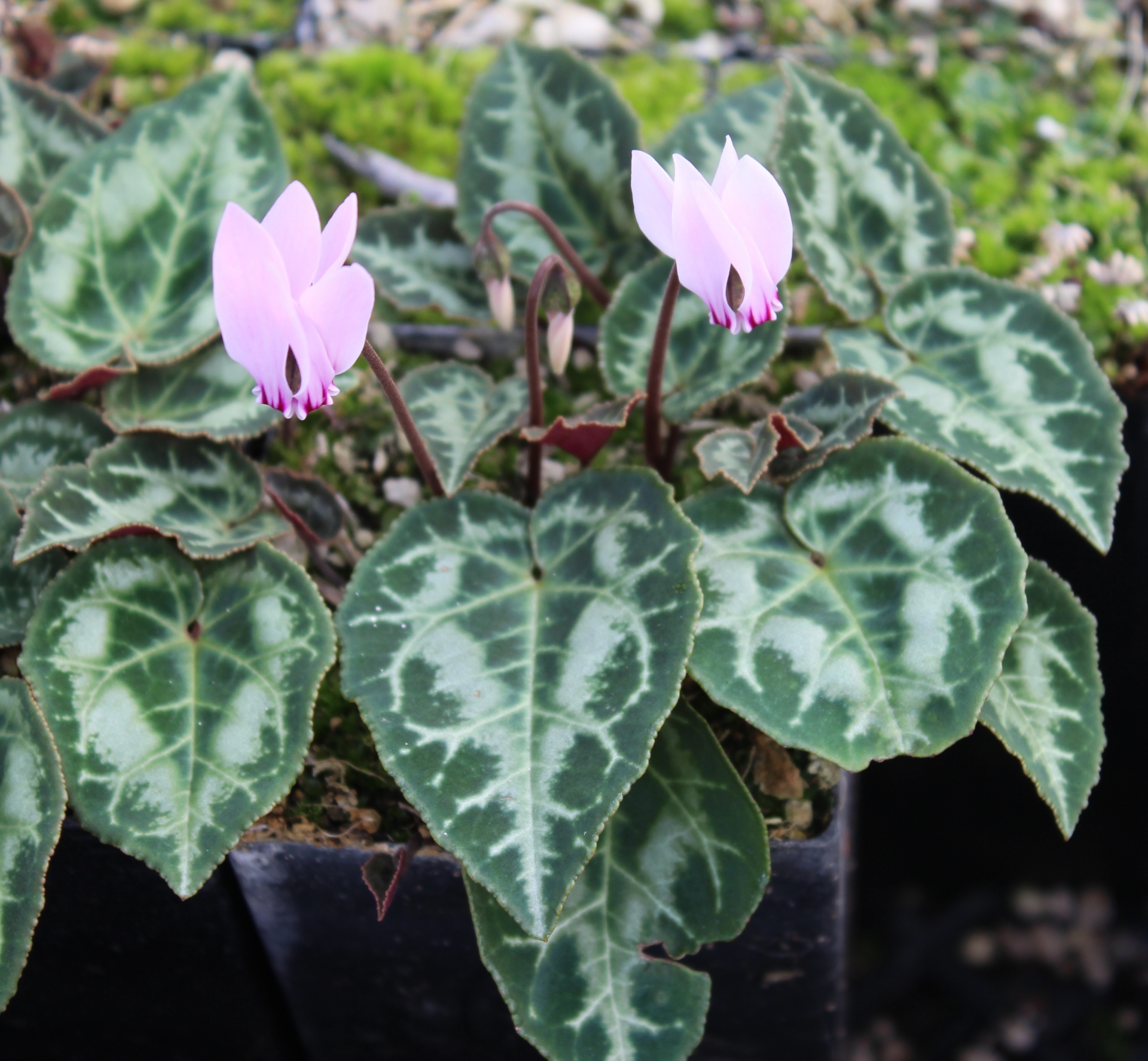 A species with absolutely amazing leaves! They are large and heavily marbled with silver and different shades of green. Has a reputation of being a shy bloomer; this is remedied by keeping them dryer in summer and also make sure they are not in too much shade. If not grown in an alpine house or zone 9, they need well draining soil in a protected area.