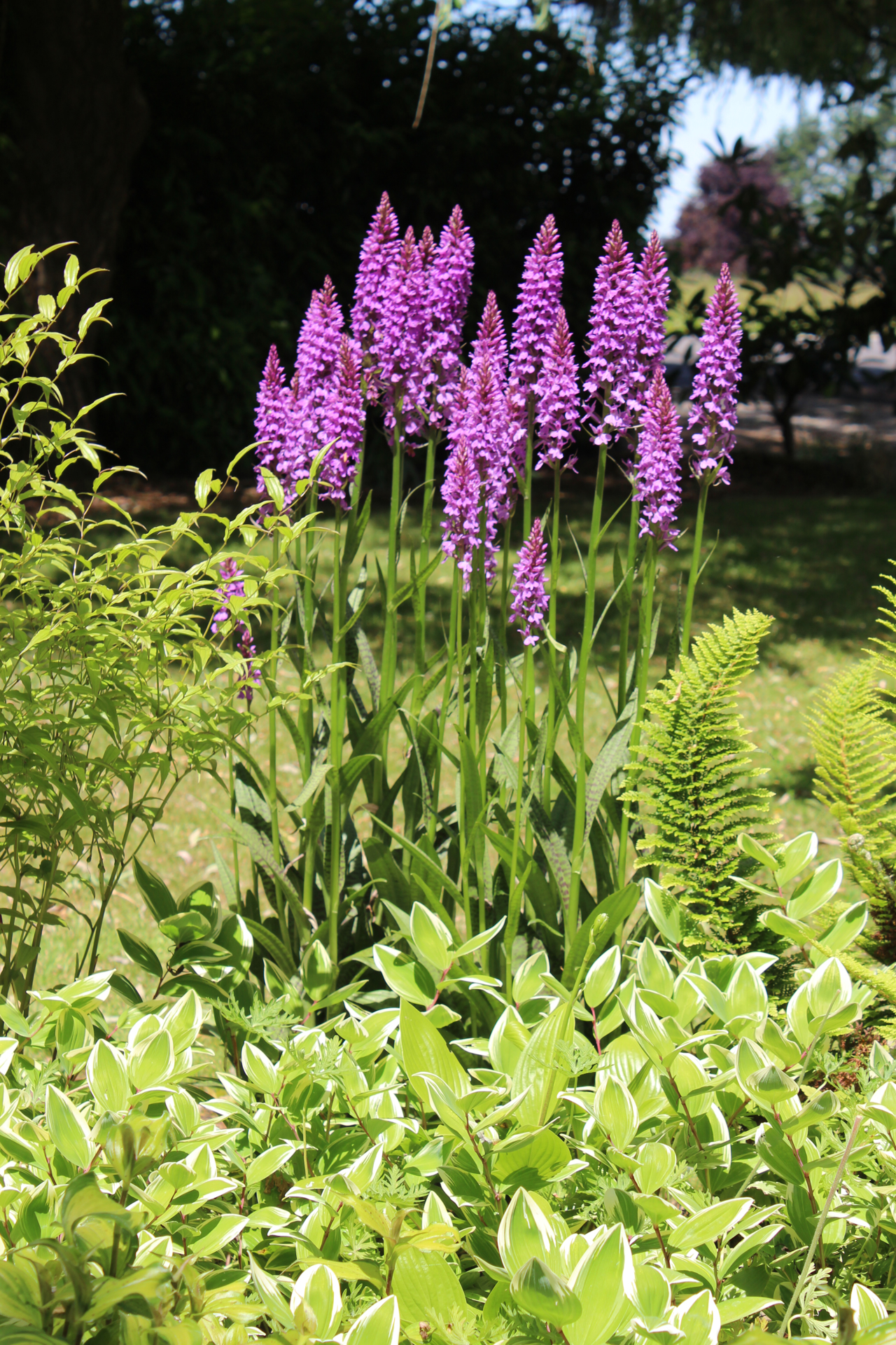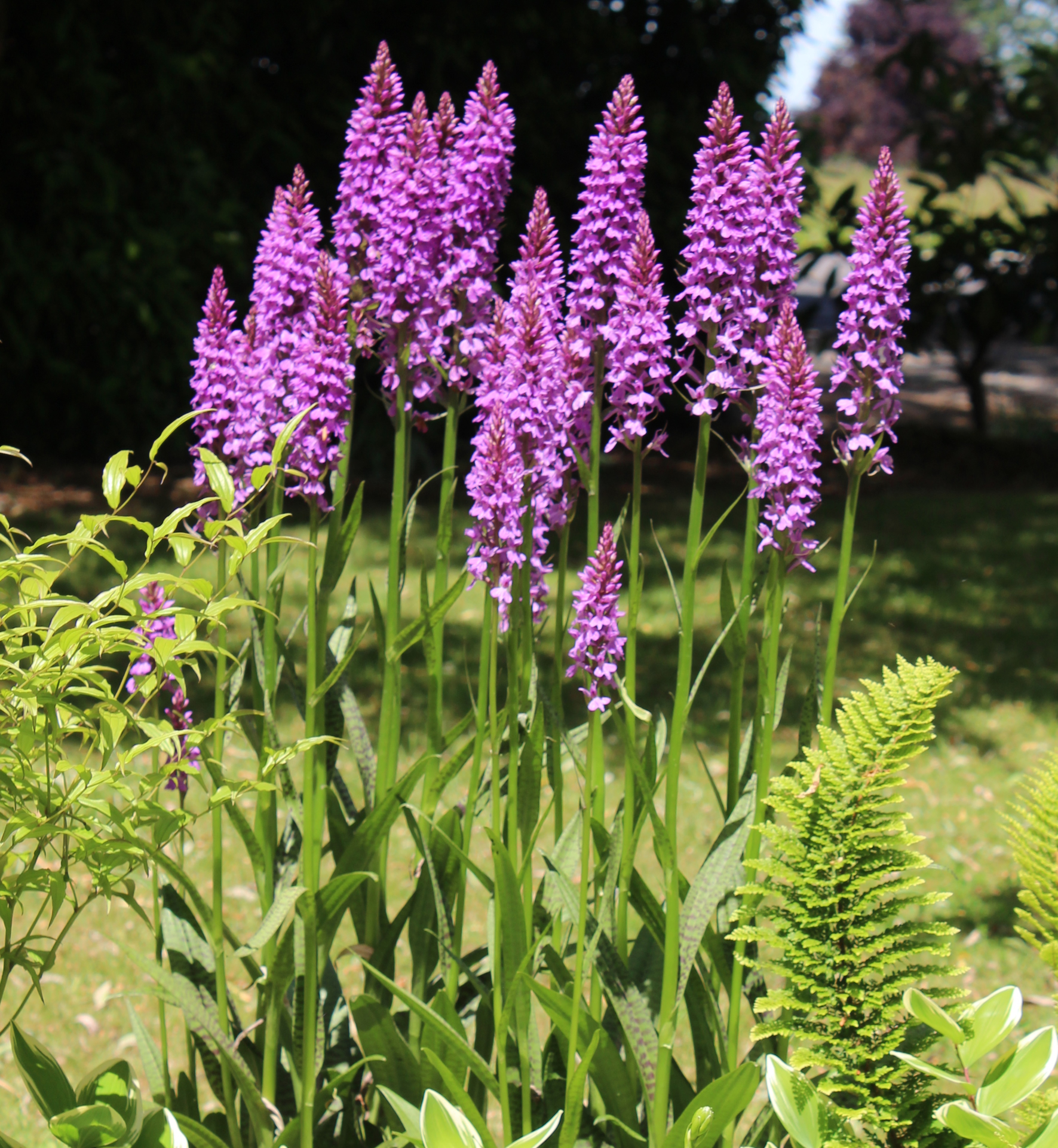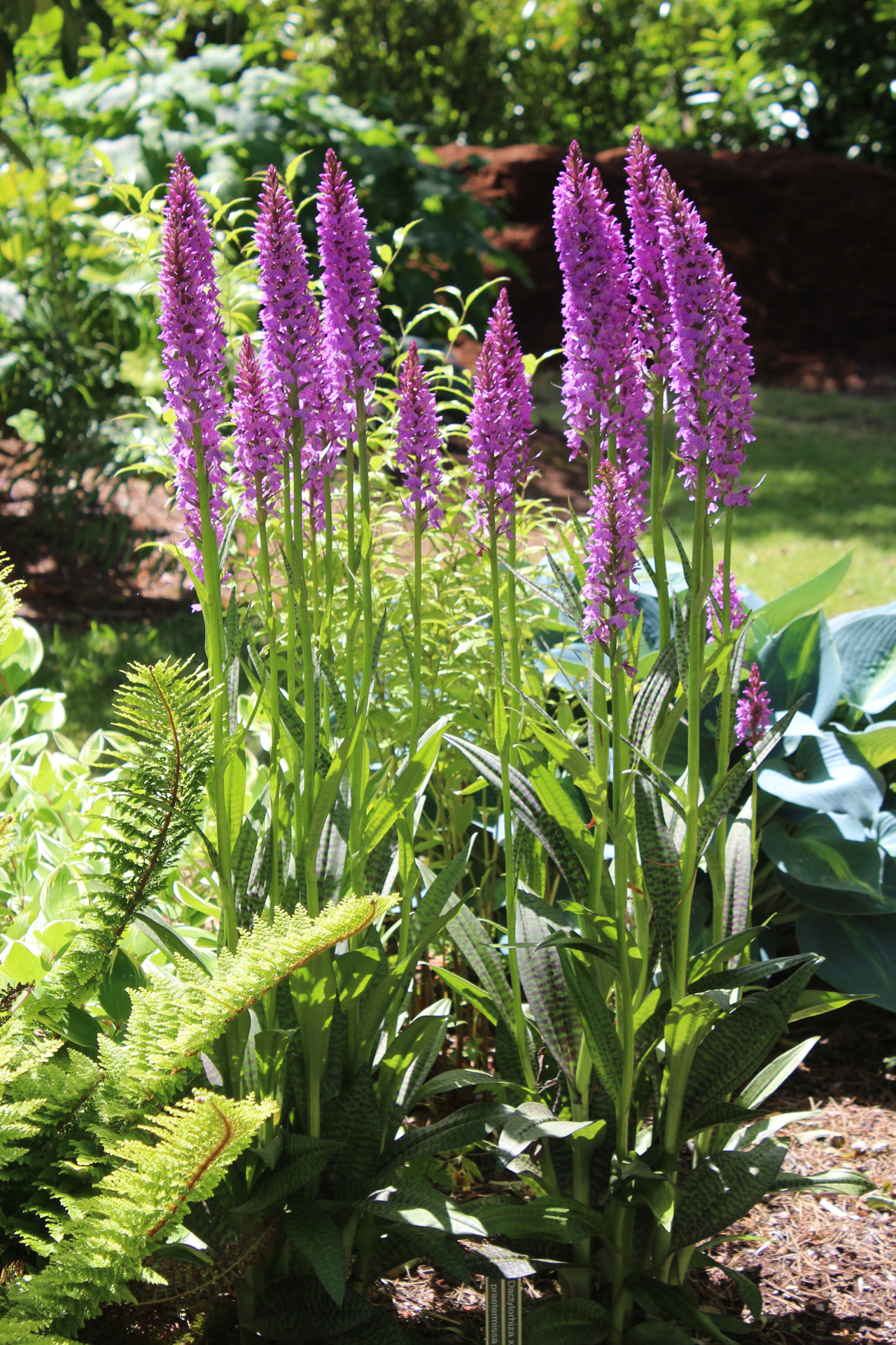 [D. praetermissa x D. fuchsii] -Large, blooming sized divisions shipped bare root August into March; in pots thereafter- By far our most striking and impressing marsh orchid offering; the flower spikes can reach over 3 feet. The leaves are prominently spotted not only before blooming but even during. We originally received this outstanding selection form Norm Kalbfleisch of Woodland Way Nursery, Portland, Oregon, over 10 years ago. Although not a fuzzy grower by any means, it does take years to multiply in order to share a few. Best in average to moist soils in sun. In warmer climates they'll tolerate half shade as well.