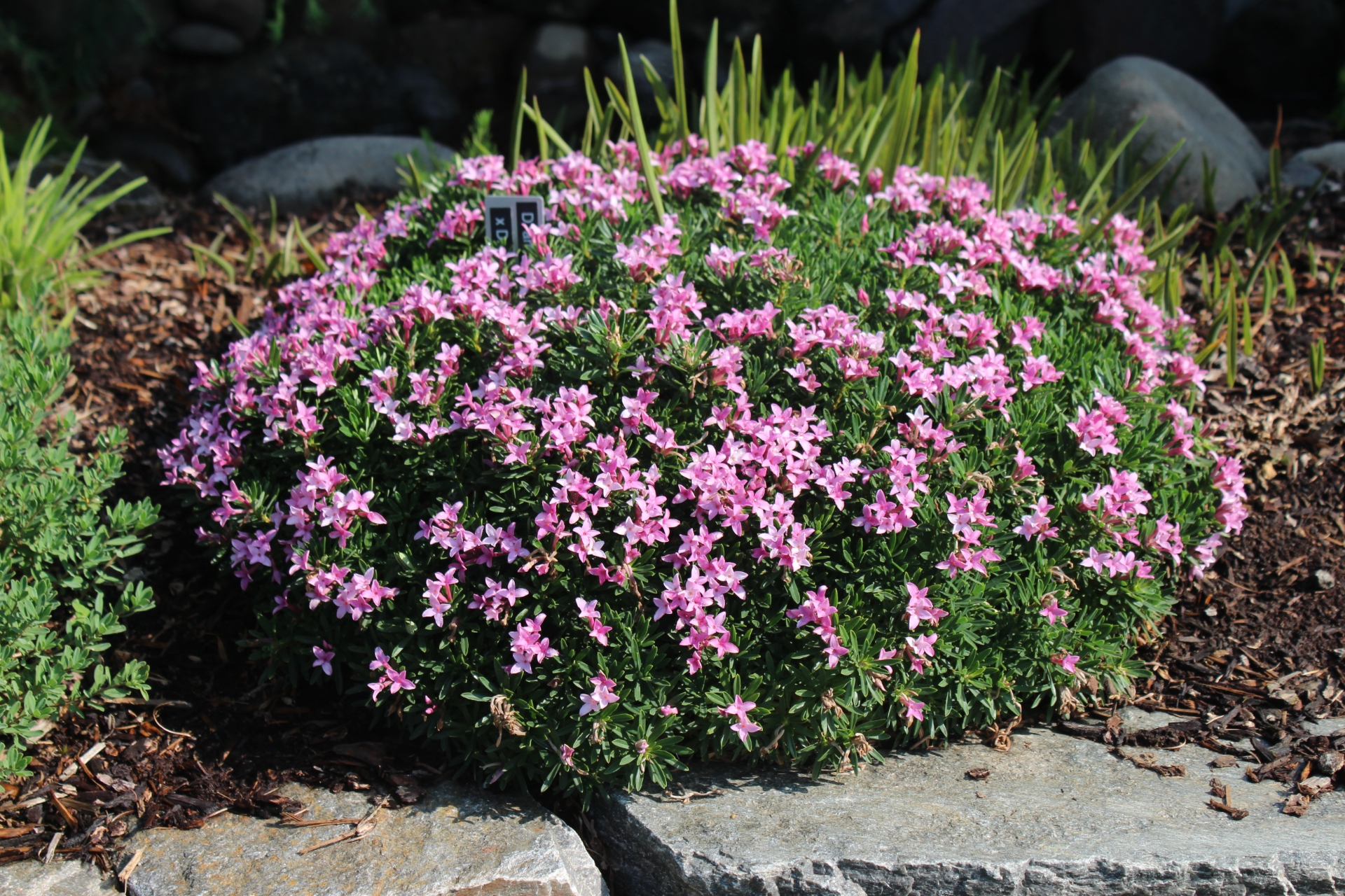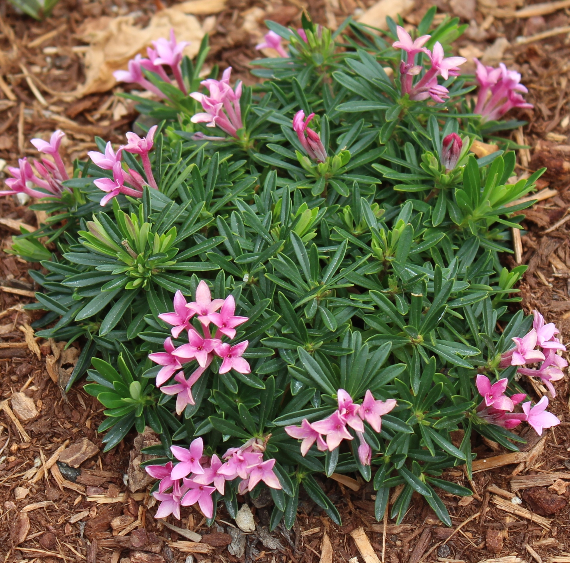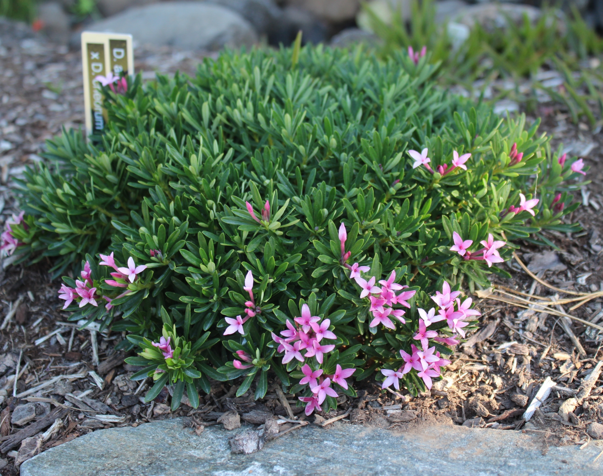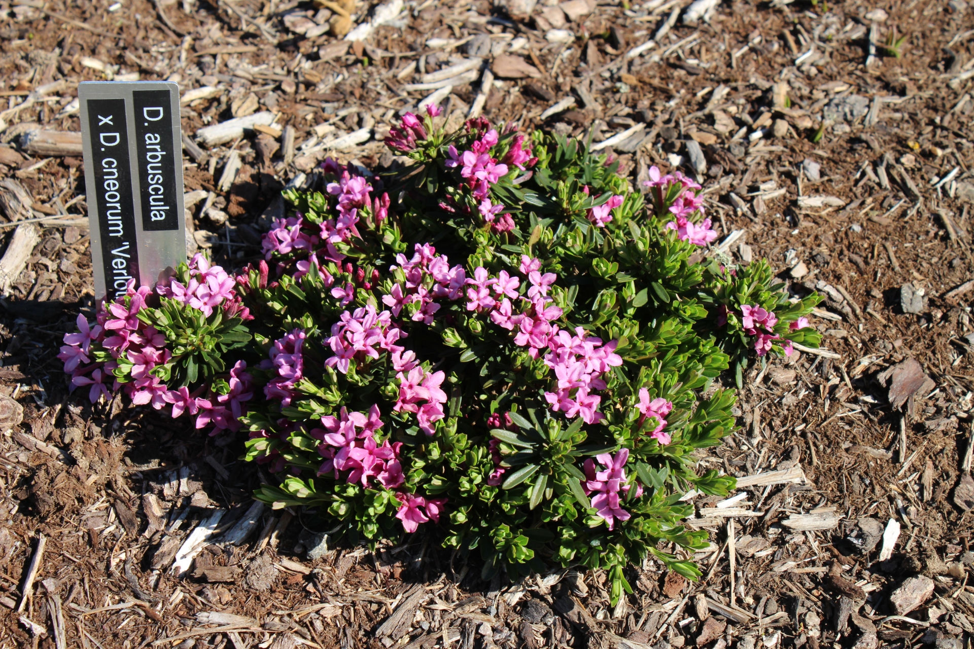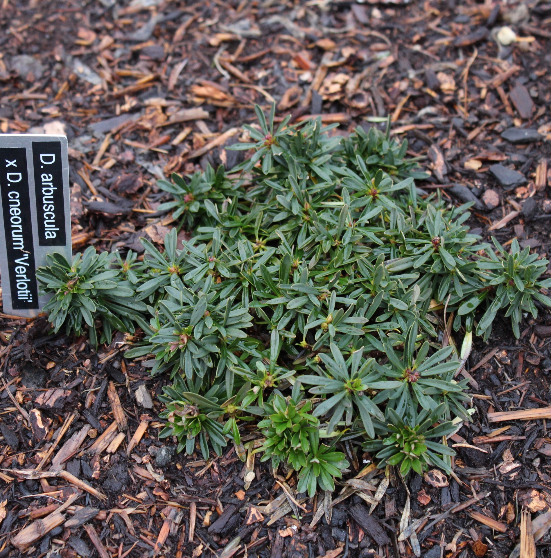 This is the reverse cross of D. cneorum f. verlotii x arbuscula and has the same characteristics with no obvious differences. Looks much like Daphne arbuscula, which is not a huge surprise considering D. cneorum f. verlotii is similar to D. arbuscula. Very slow growing but eventually can reach 18" across. Usually winter dormant except in mild winters in milder zones.