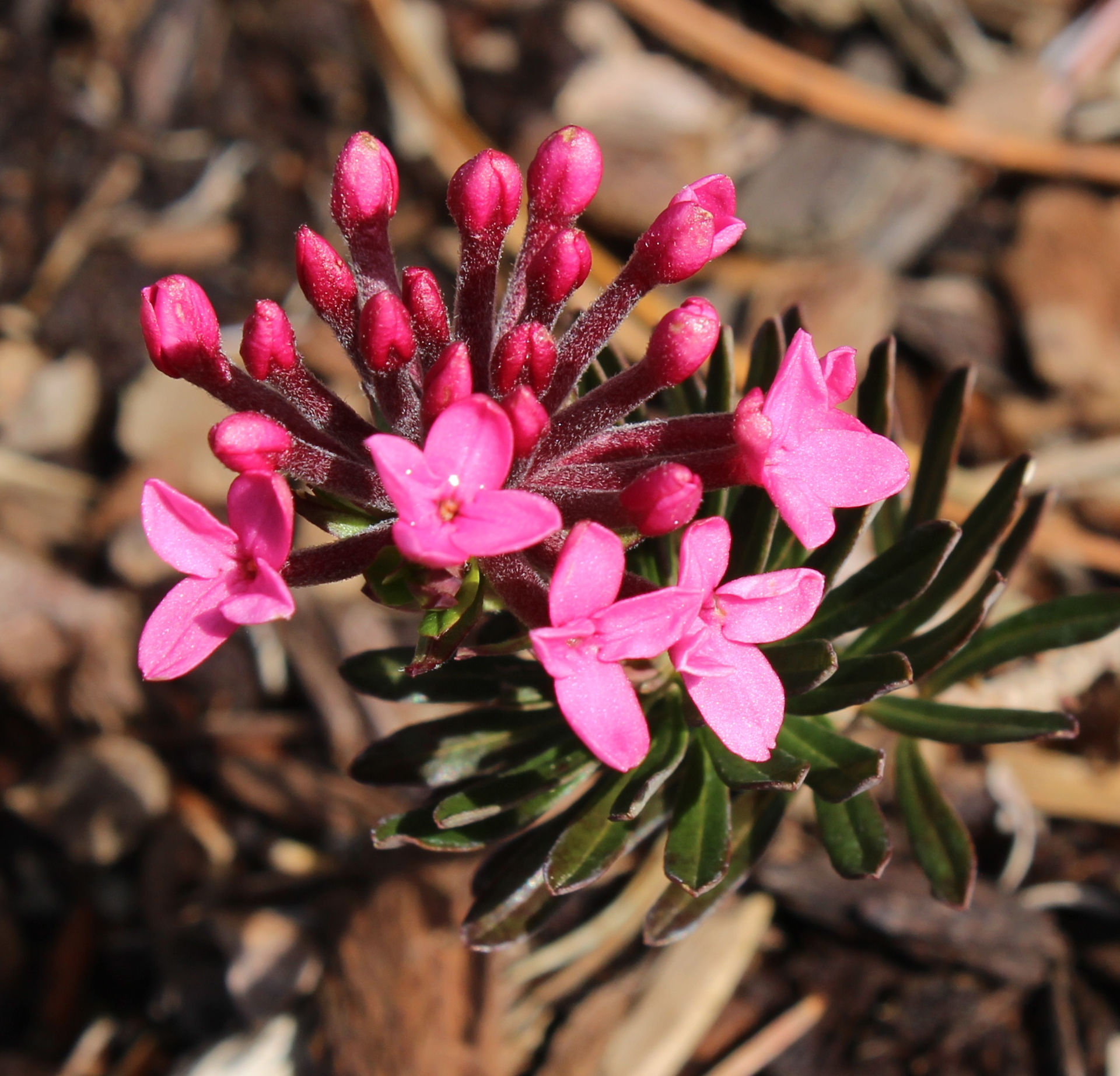 A distinct selection with narrow dark green, needle-like foliage and a rather sprawling growth habit. The very fragrant flowers are a rich pink. While the plant doesn't get much taller than 10", it can spread 2-3 feet.