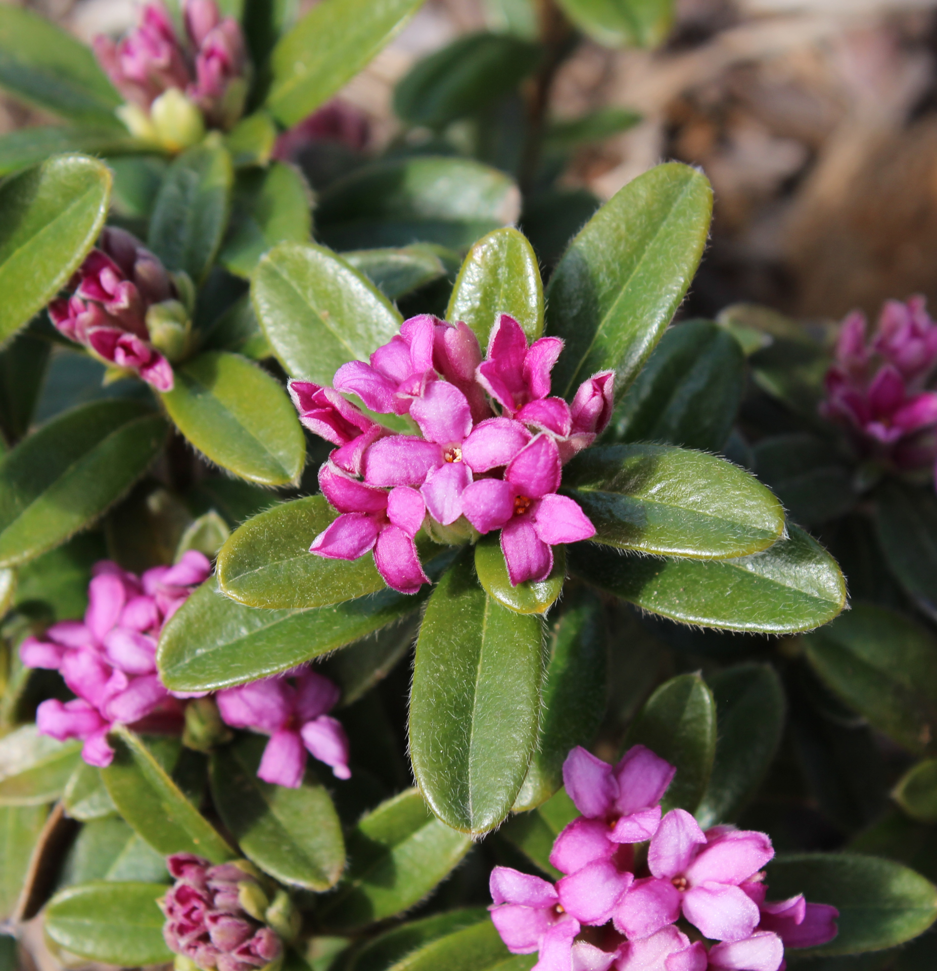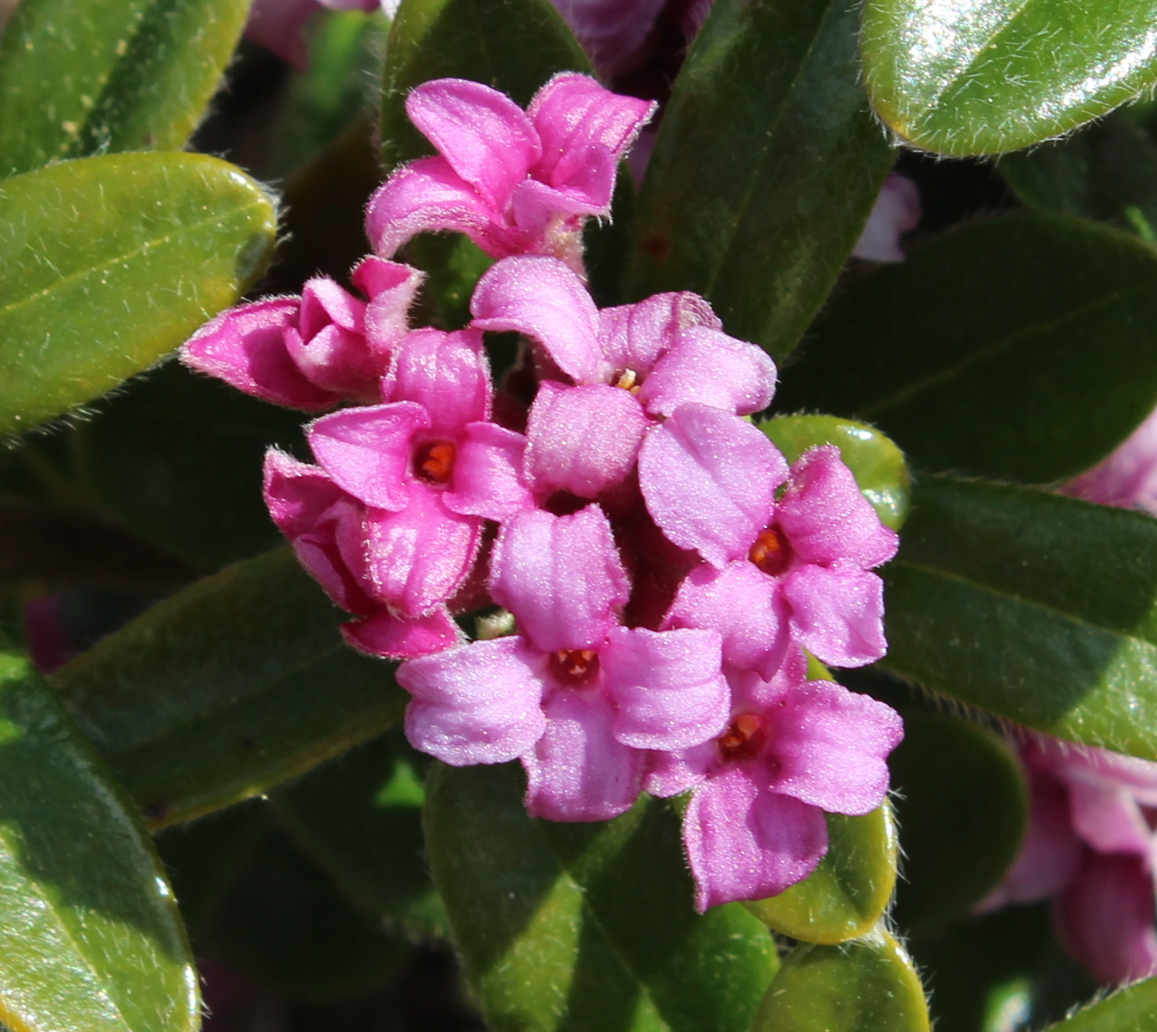 A distinctive yet somewhat elusive species; you'll find it listed besides Daphne collina also as D. sericea 'Collina' and D. collina of gardens. Many excellent hybrids, like the two large groups of D. x nepalenes and D. x susannea have D. collina as a parent. Apparently it used be offered wholesale in Oregon a while back but after much searchingwe didn't find any. Several years ago I was able to find one in Switzerland and the slow process of establishing stock and eventually a few plants to share started. It's not found in the wild (anymore) but the plant at hand has several defining characteristics distinguishing it form Daphne sericea, particularly in the evergreen leaves: they are glossy, dark olive-green and much wider than D. sericea. While the surface is haired like in sericea, the edges are more prominently fringed with hair, especially the newer leaves. The flowers are similar to D. sericea and just like them, D. collina can re-bloom throughout summer and fall. Please note this description applies to this specific clone, as there are several different ones floating around worldwide.