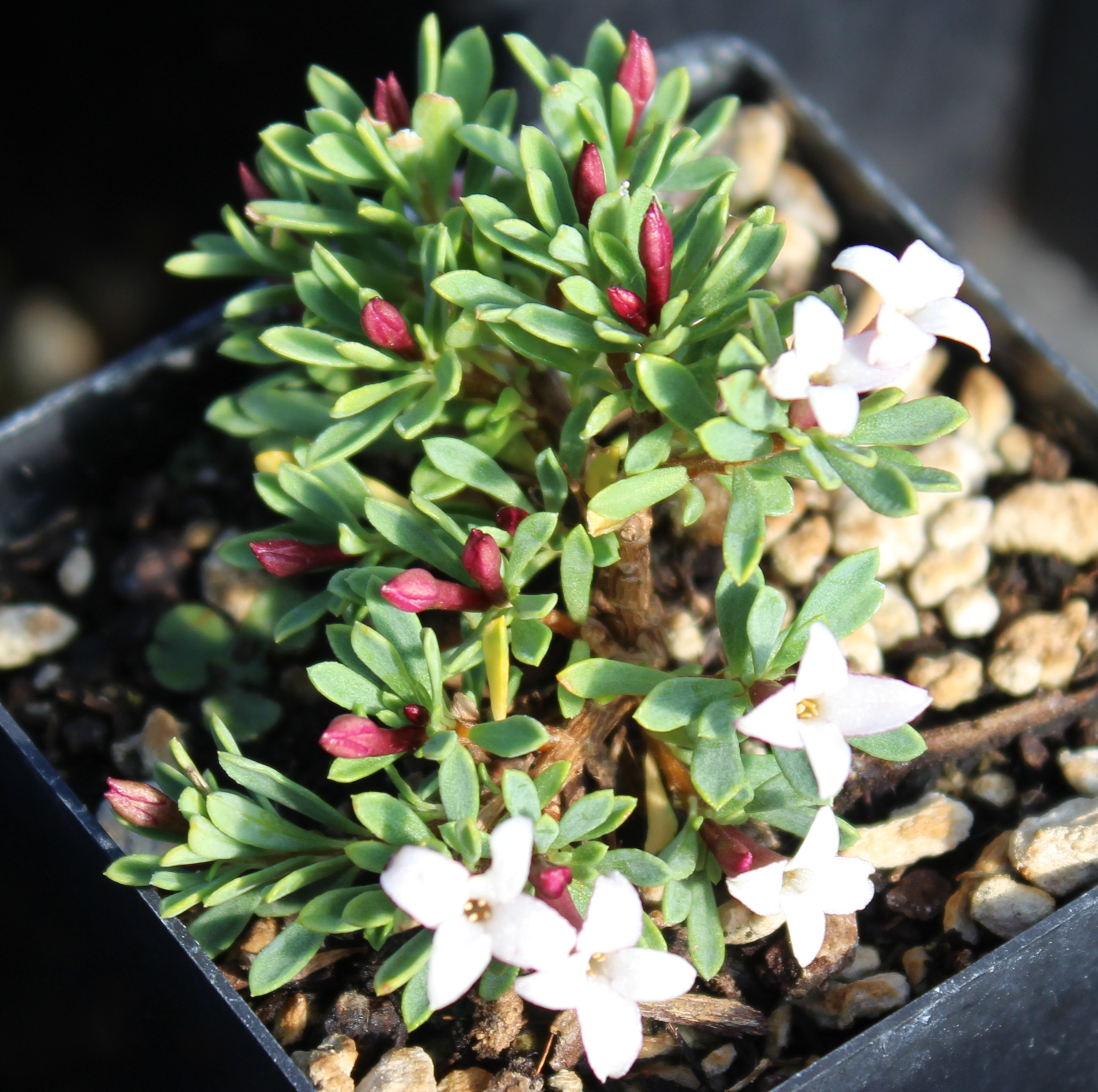Aka. "Delphi Form", a rarely offered species from Greece, where it grows in limestone cliffs. The growth habit is spreading, growing to dense mounds up to 36" wide. The leaves are small, narrow and blue-green, which stay over winter in milder climates or in a alpine house. First flowers appear in spring, but the main season is in summer; for us here in Oregon it's in bloom all summer into fall. The lobes (petals) are almost white, while the buds and tubes are red, creating a great contrast against the foliage. This plant needs excellent drainage and some sources put it in USDA zone 6.