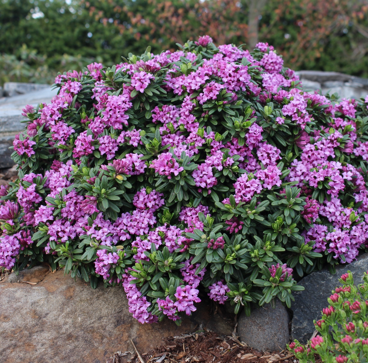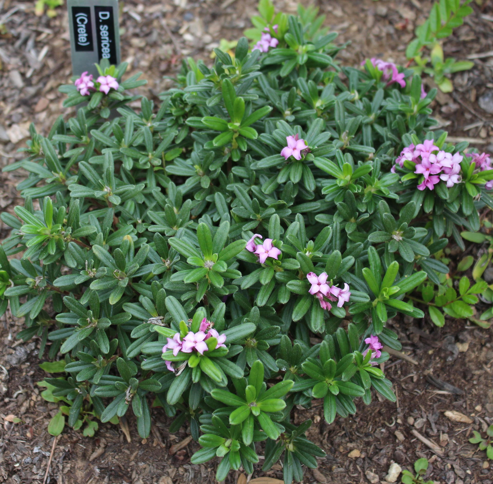 Daphne sericea is one of the few species that bring a reliable re-bloom into a hybrid, like in D. susannae. The species by itself makes a great and easy to grow garden plant, with dark evergreen foliage and lots of very fragrant flowers. The main flush occurs in mid-spring and after a short break they'll usually bloom throughout summer into fall. Possibly hardy to USDA zone 5.