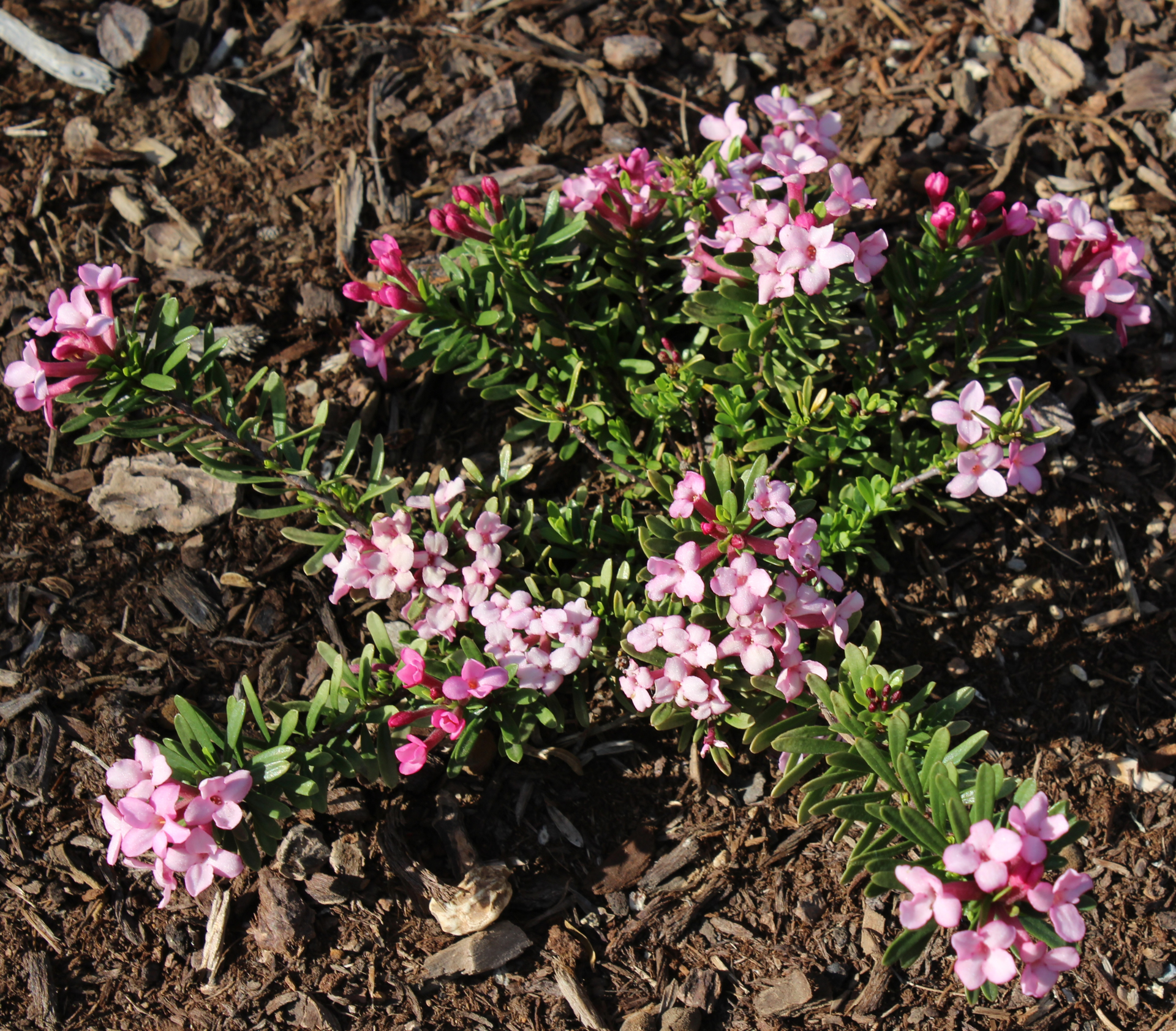 Daphne x hendersonii (D. petraea x D. cneorum) is a naturally occurring cross and most all selections are highly desirable plants. Not the least is 'Kath Dryden', a cross made by Robin White in 1997. Bright deep pink buds open to fragrant, mid-pink flowers. The dark green leaves are long and narrow.