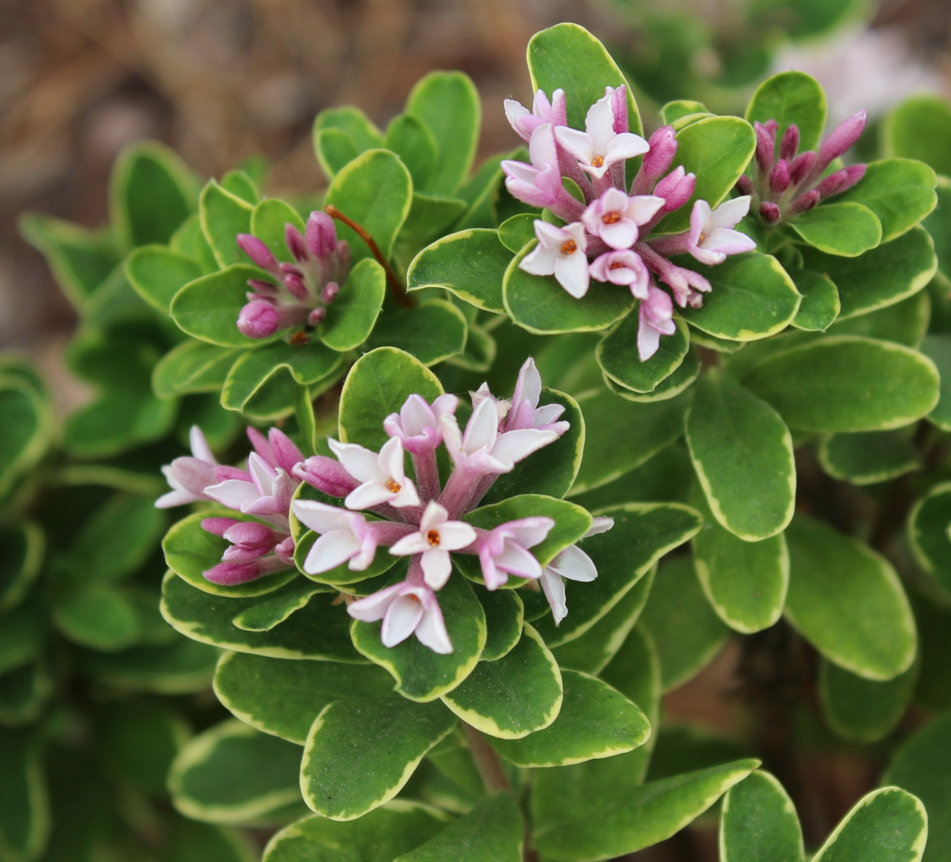 [D. x burkwoodii 'Somerset' x D. tangutica] Quite similar to D. x 'Rosy Wave' - indeed sharing D. 'Somerset' as parent - with clusters of strongly scented, mid-pink flowers. The relatively large leaves are gold-edged, evergreen in mild zones (USDA 9) and more dormant the colder the zone gets.