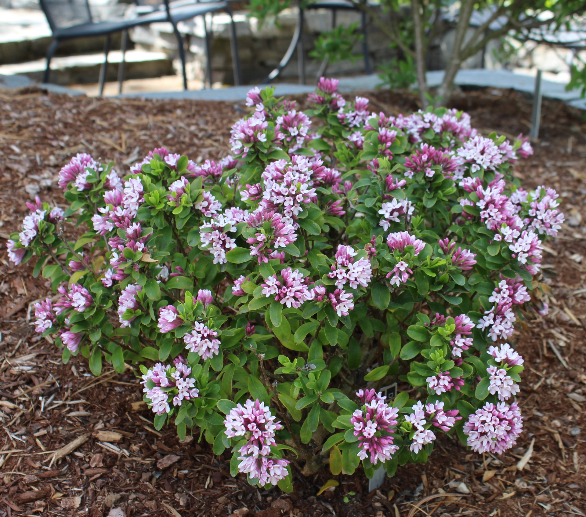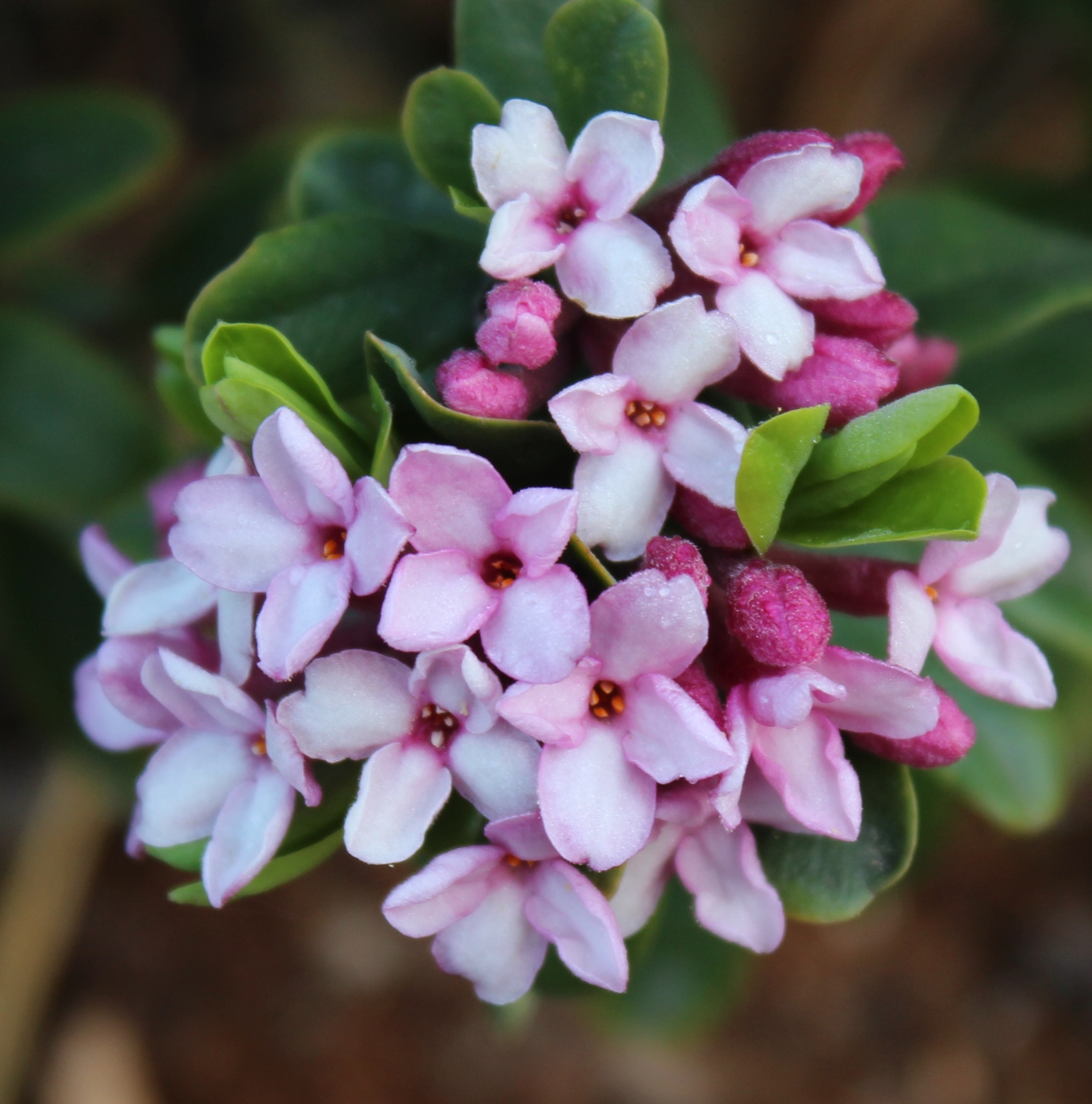 [D. x burkwoodii 'Somerset' x D. tangutica] Quite similar to D. x 'Rosy Wave' - indeed sharing D. 'Somerset' as parent - with clusters of strongly scented, mid-pink flowers. The relatively large leaves are evergreen in mild zones (USDA 9) and more dormant the colder the zone gets.