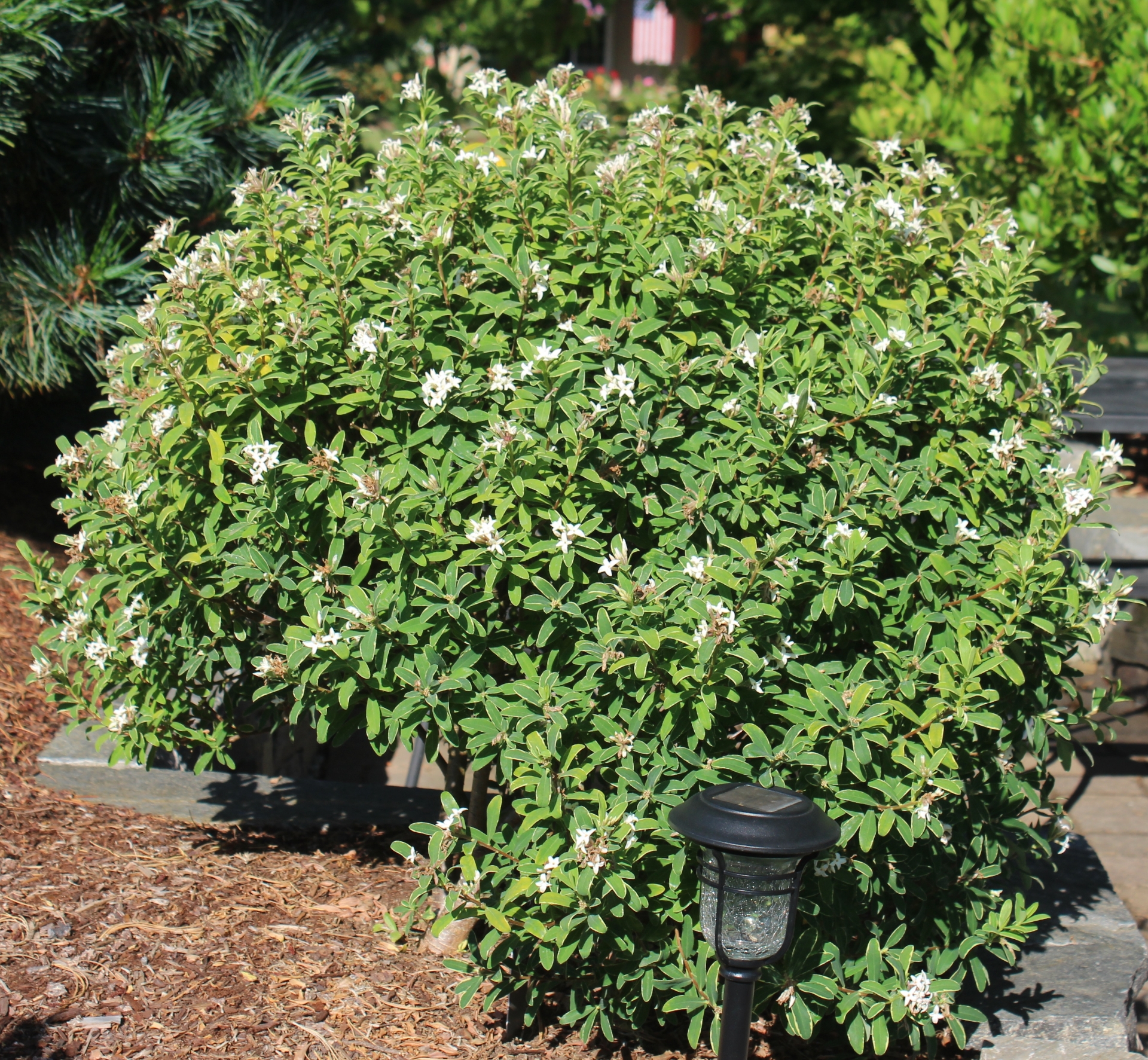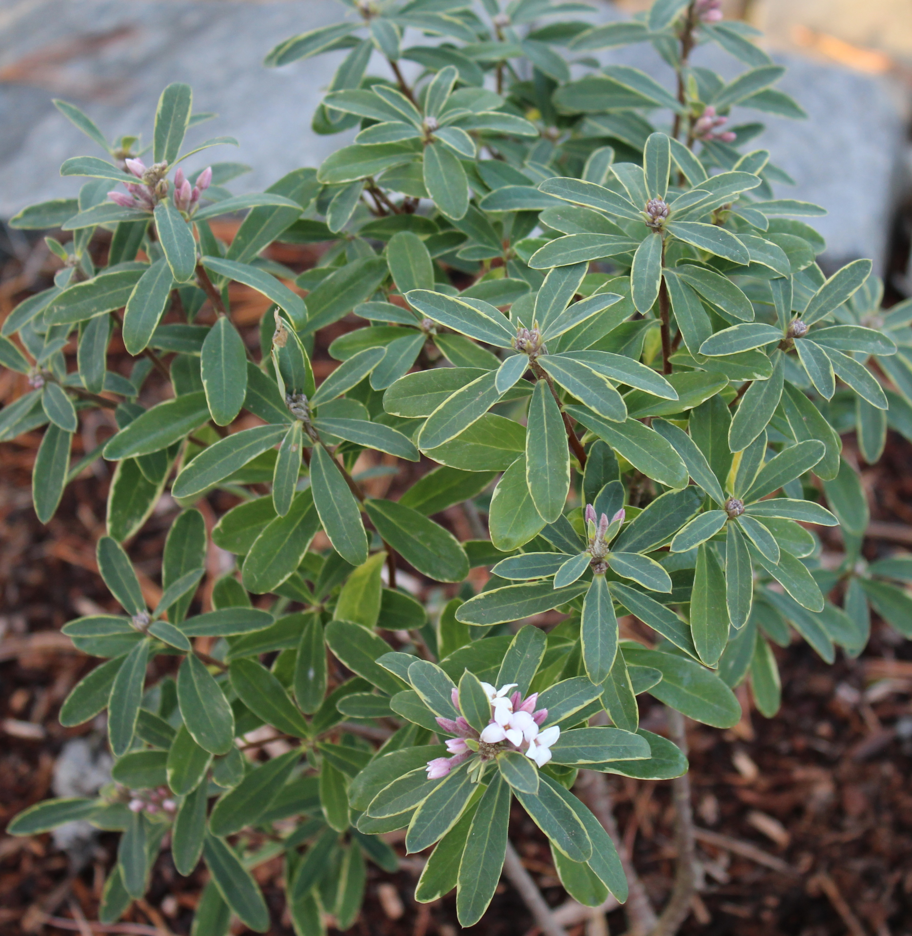 Much the same as 'Eternal Fragrance', but with a light yellow to ivory white narrow edge on the leaves. The fragrant flowers are produced throughout the season; pink-flushed in the cooler weather, white in summer. Semi-evergreen to evergreen in milder zones but can go completely dormant in colder ones.