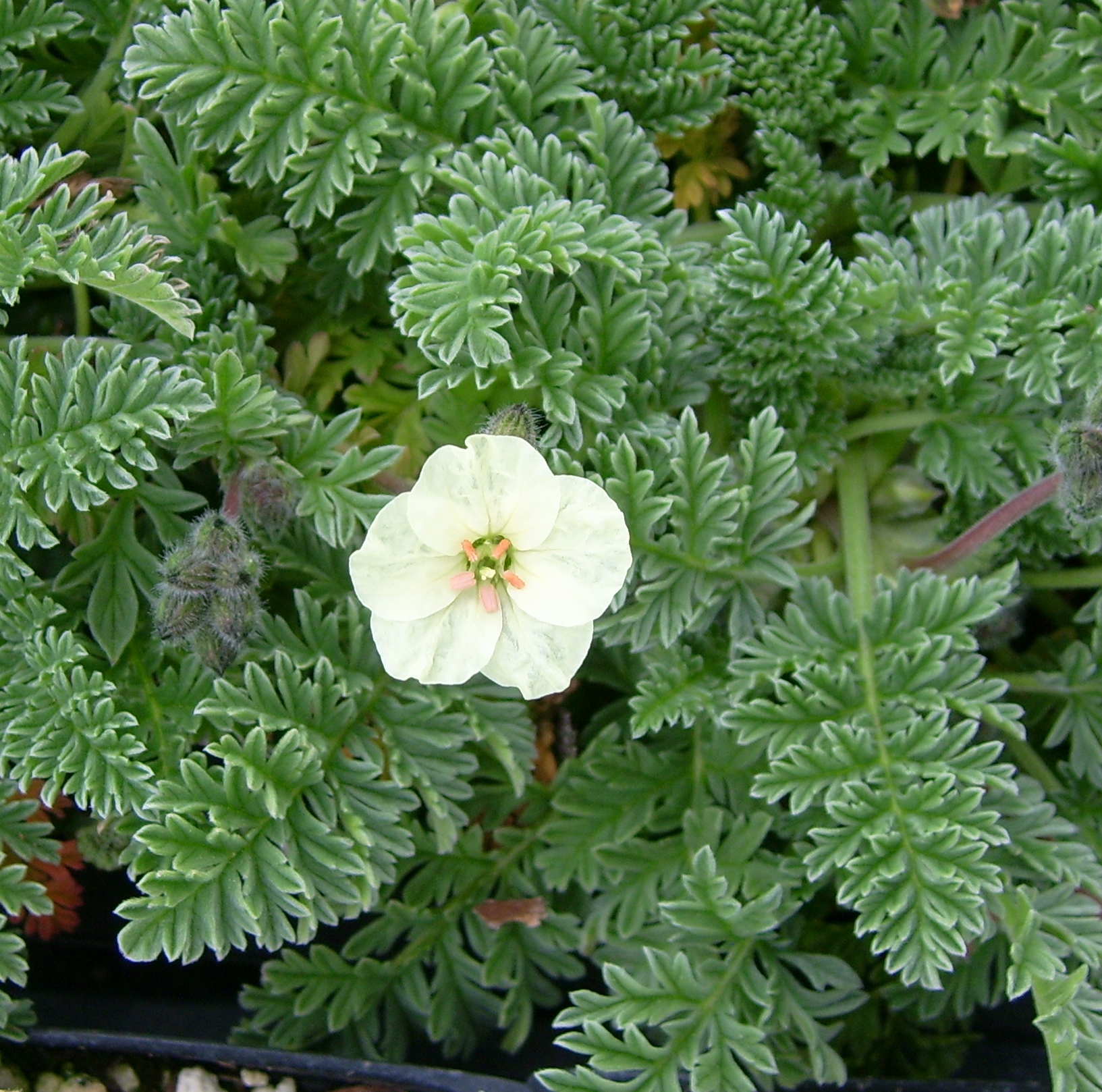 It's basically a pale yellow flowering Geranium, to which Erodium are closely related. This makes it a very unique plant. Grows in mounds of feathery, silvery green leaves. Likes well drained soil.
