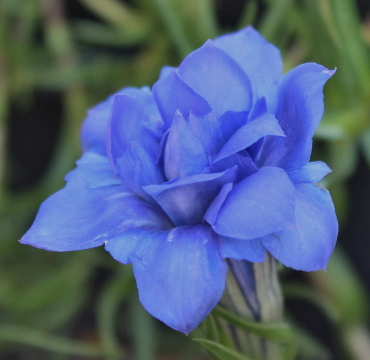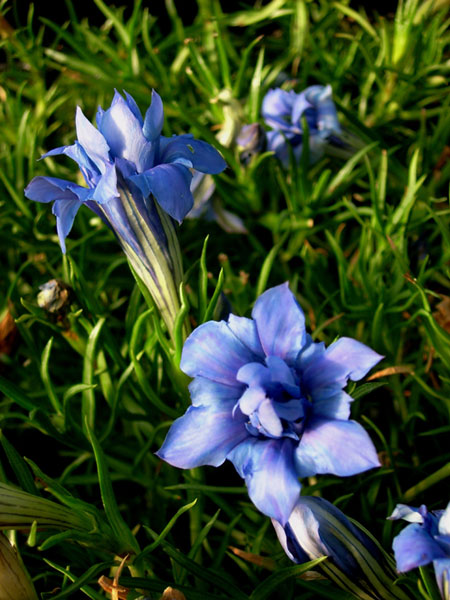 -As of September 25, 2023, theses will come trimmed, with new growth showing for next spring-. The worlds first double gentian! And deep blue at that. Grows in mats of grassy foliage and produces bunches of double trumpet-flowers, striped on the outside. Relatively easy in acidic soil and summer moisture. They take full sun for us with occasional low 100s; for hotter climates afternoon shade is recommended.