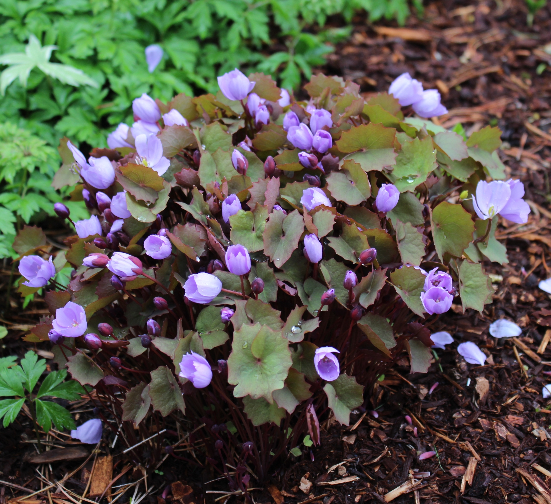 The Asian version of this Epimedium relative. The leaves are more lobed and not as prominently divided as in our native J. diphylla. The flowers are much more intensely colored, lavender to lavender-blue and cup-shaped. Overall a slower grower but easy in a well drained, moist soil. Will endure drier spells late summer.