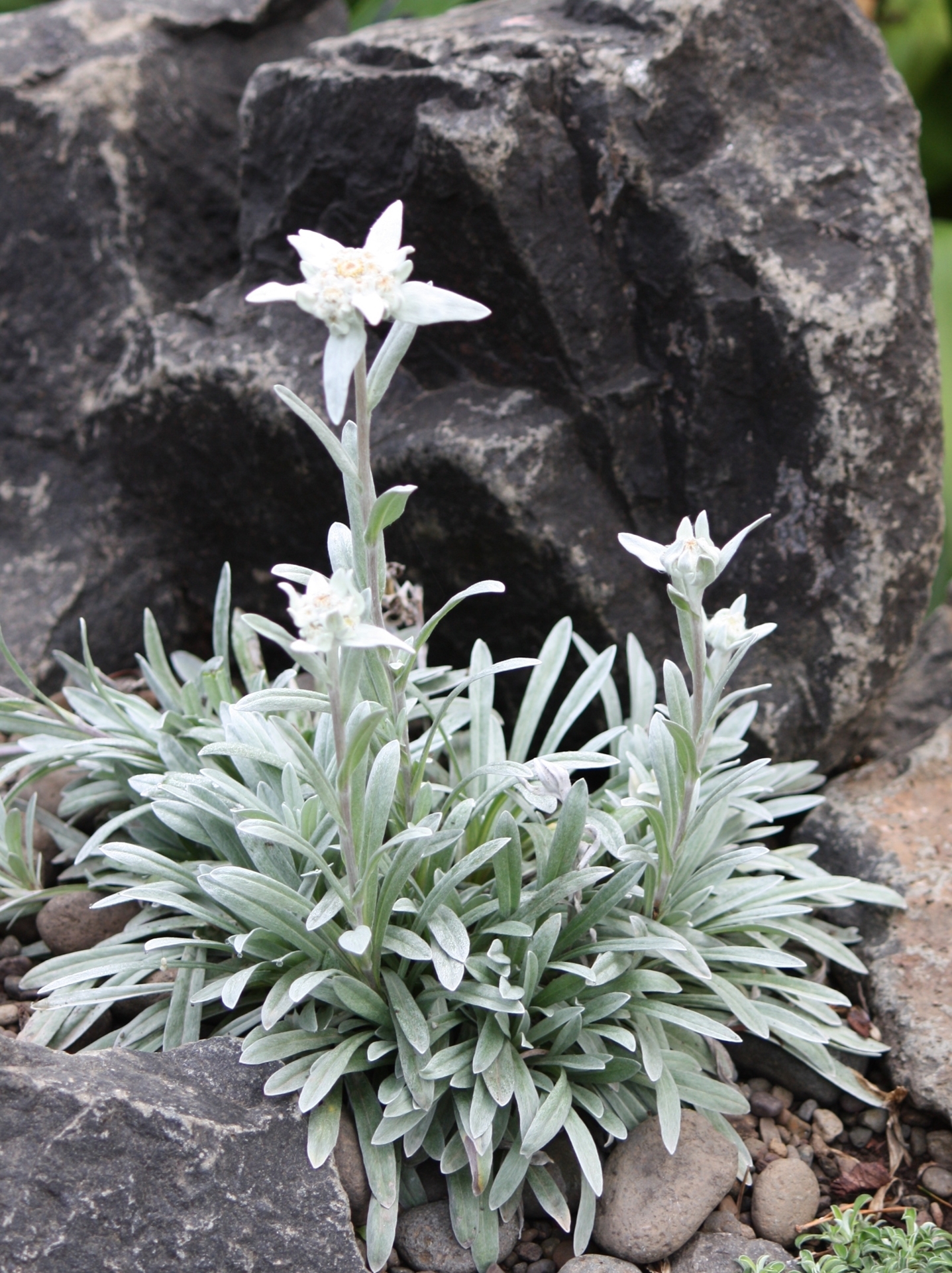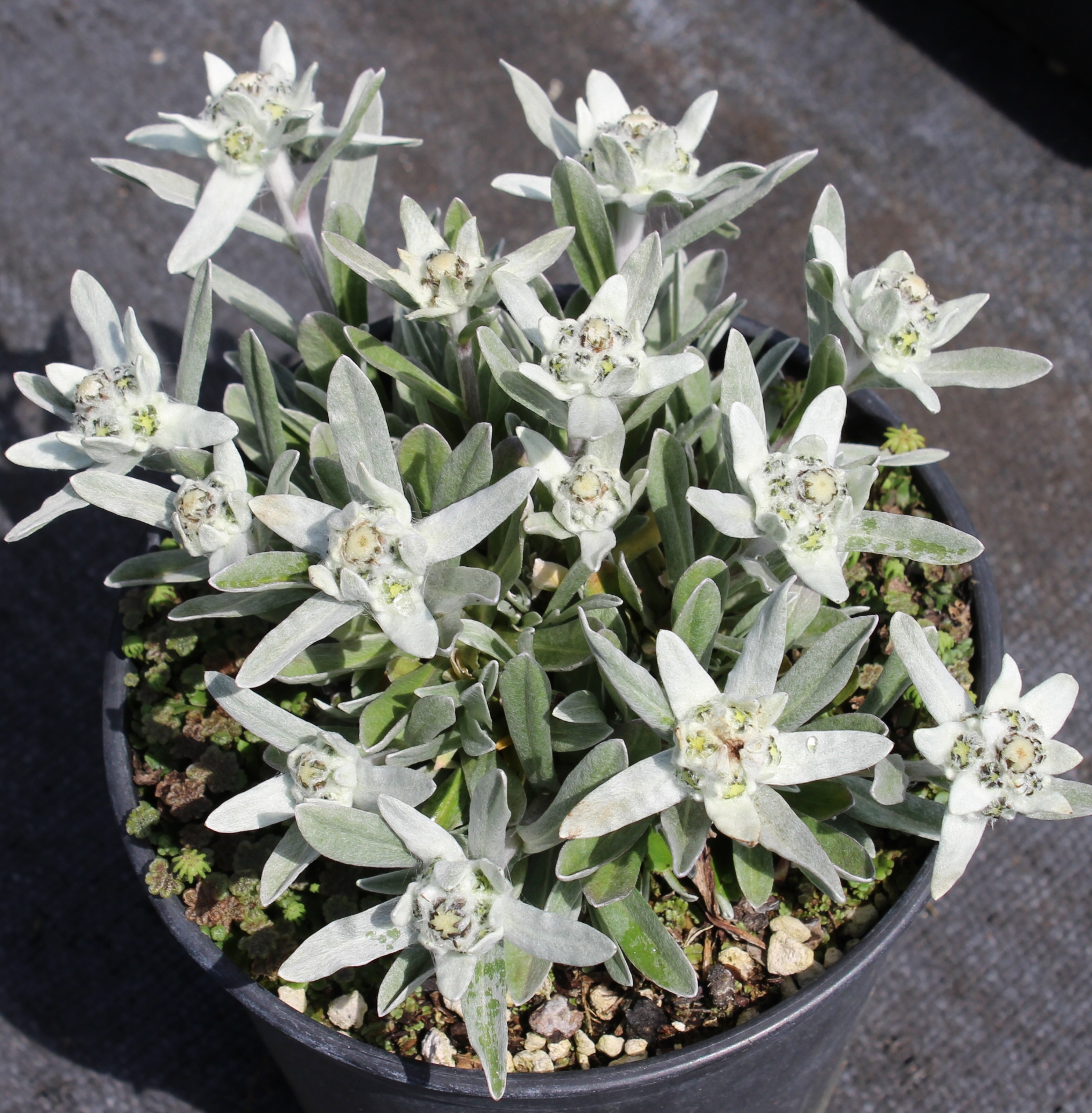A chance seedling between the European Edelweiss and L. nivale from Tibet, occurring at our nursery around 2012. It has inherited the best of both worlds (pun intended): The silver leaves and longevity from L. nivale Tibet and the floriferousness and vigor from the European Edelweiss. For us, the earliest to bloom of all Edelweiss and reblooms late summer/fall. For average to lean and well drained soil. BEFORE ORDERING, PLEASE read very important information about growing Edelweiss on top of the Edelweiss main page.