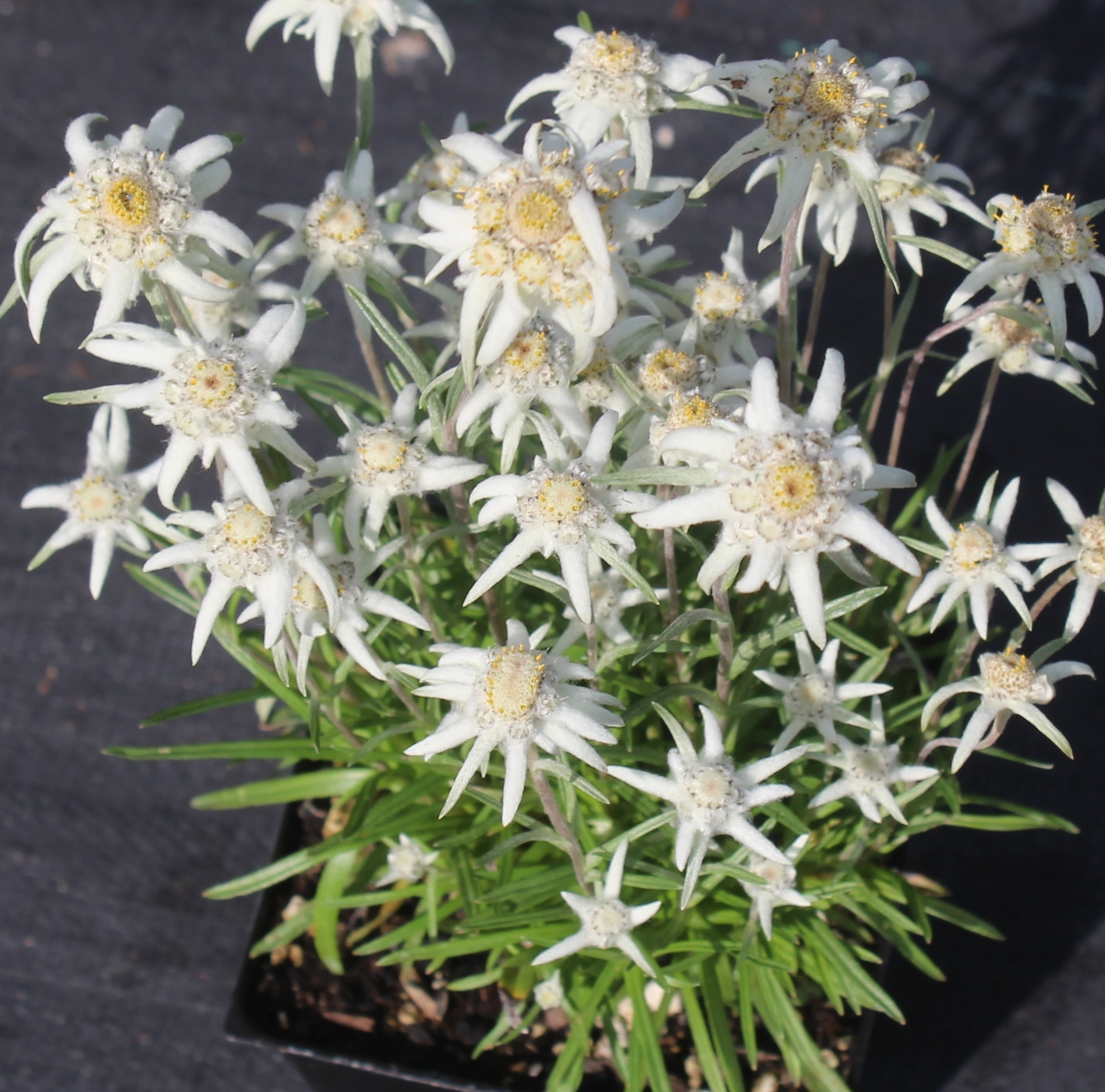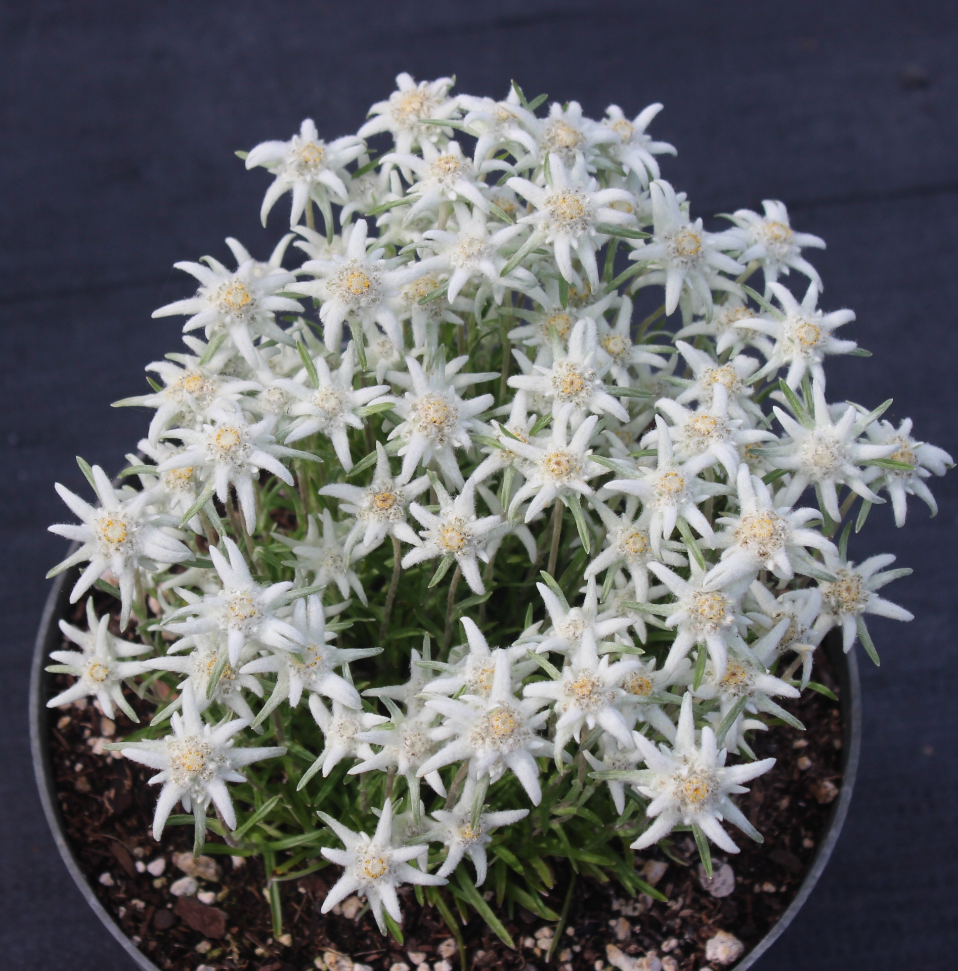 A seedling occurring here caught our attention when it bloomed into December, which is most unusual and in fact unheard of. Before getting too excited - suspecting it was only a fluke - we watched it for several years. Indeed we didn't get flower in December the following years but consistently a heavy bloom October into November, after a full flush of flowers in June, extending the bloom season for Edelweiss in general. Named after my wife Victoria, whose favorite season is Fall. BEFORE ORDERING, PLEASE read very important information about growing Edelweiss on top of the Edelweiss main page.