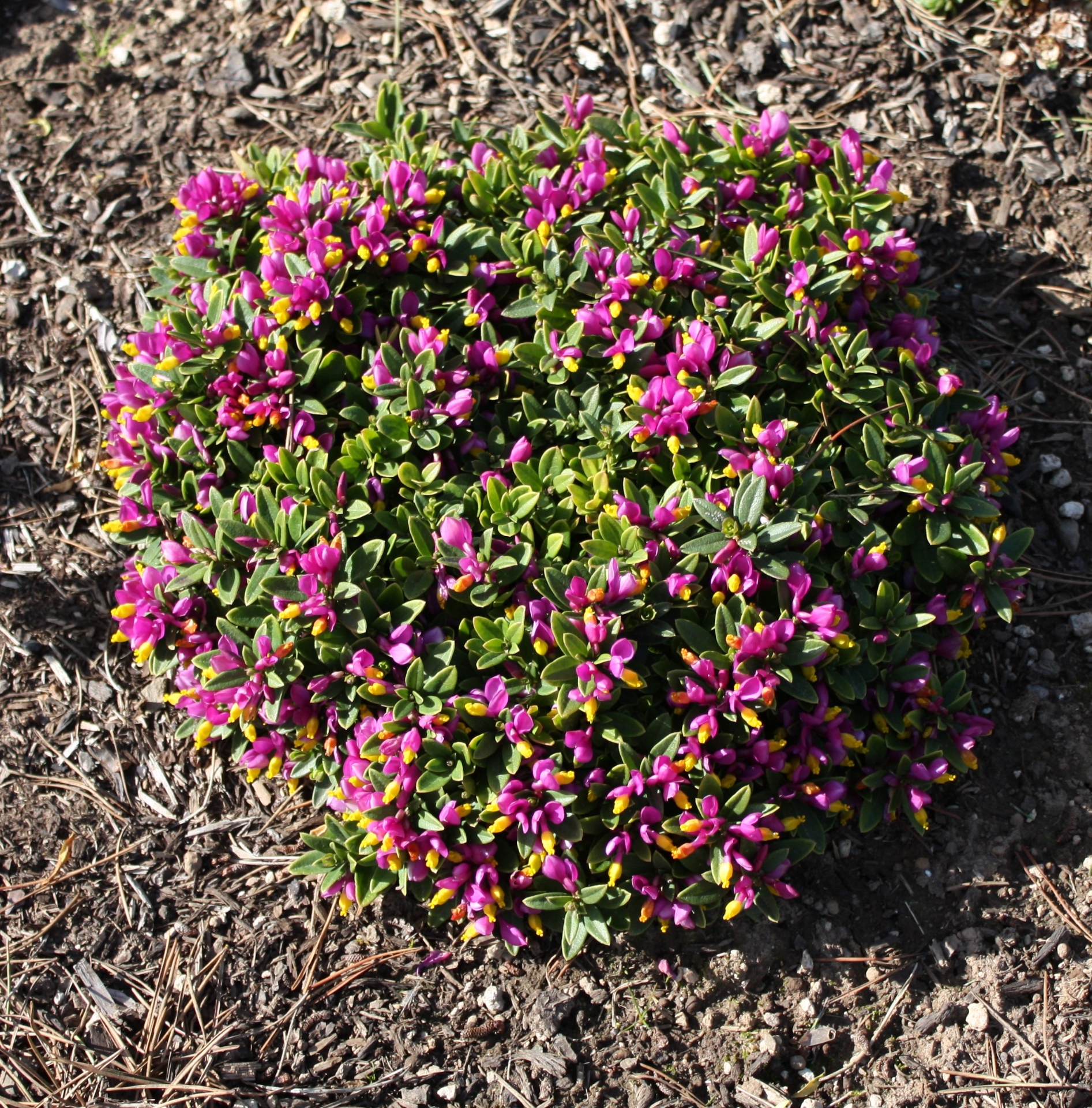 A much underused and unknown native of the Alps, growing along with trumpet gentians in open meadows. The pea-like flowers are composed of magenta wings and bright lemon-yellow lips. Grows as a low, slow spreading shrub with leathery, evergreen foliage, which is much like boxwood except narrower and pointy. Likes the same conditions as trumpet gentians; full sun to light shade in well drained soil. Drought tolerant once established but does like summer moisture.