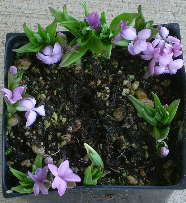 -These may be shipped as bare root through March and as potted rhizomes thereafter; they don't root-in until summer.-Another dwarf with lavender-pink flowers, but they are up-turned and the leaves are broader. Grows to small colonies over time, quite a time.