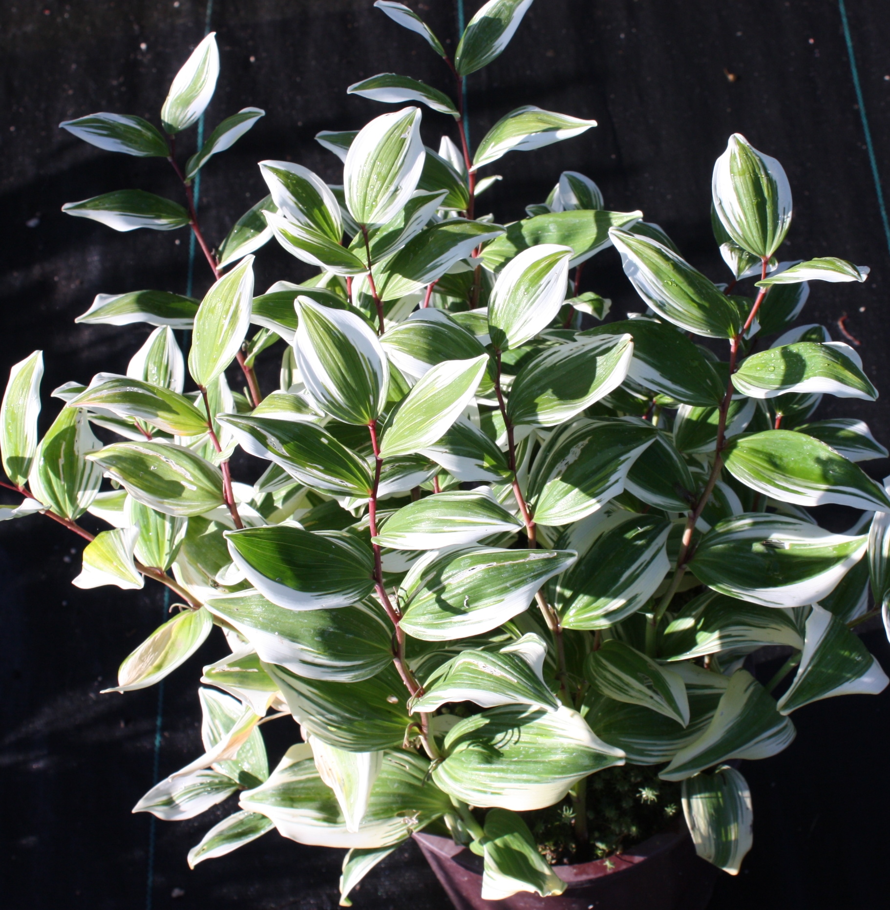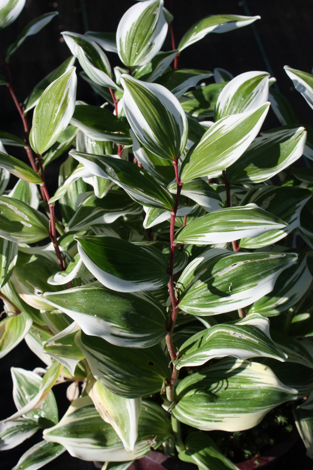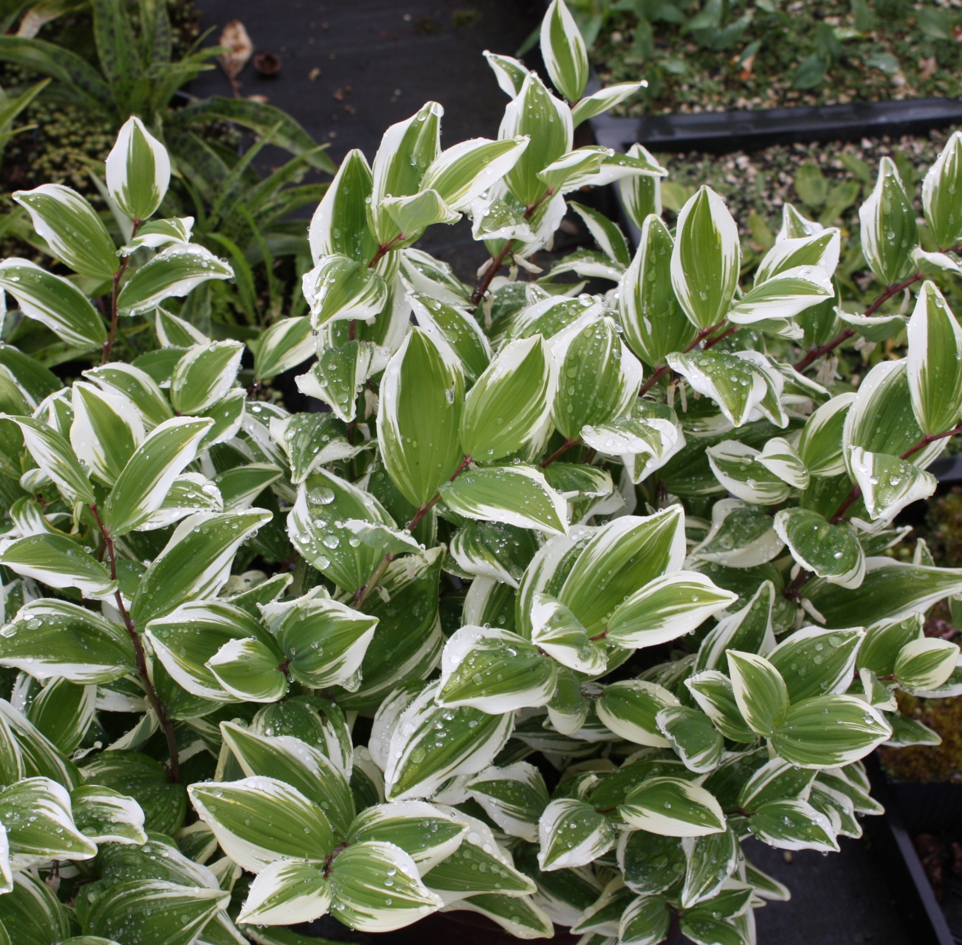 -Shipped as bare root through March and as potted rhizomes thereafter; they don't root-in until summer.-This is one of the brightest selections of any Salomon's Seal, with an extra wide, crispy-white margin on each leaf. Although "Doublewide" has a cheap insinuation, we got ours at $90.00 in 2007! Now we finally have a few to share. Note: May be shipped as bare root divisions or potted but not rooted in, as Polygonatum roots late in the season.