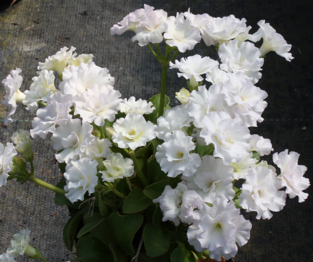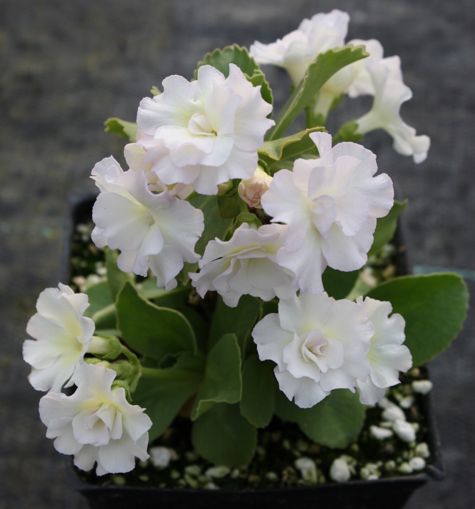 An almost pure white selection with frilly-ruffled, medium-sized double flowers. As they mature, they take on a pinkish tint. Grows in most well drained garden soils. Full sun is fine in higher elevation and/or cooler regions, otherwise needs a place without afternoon heat.