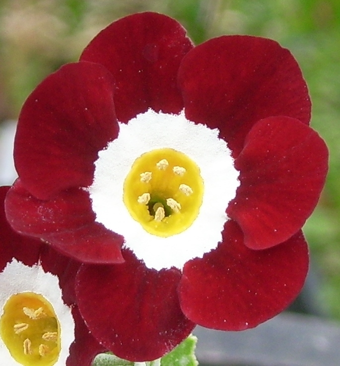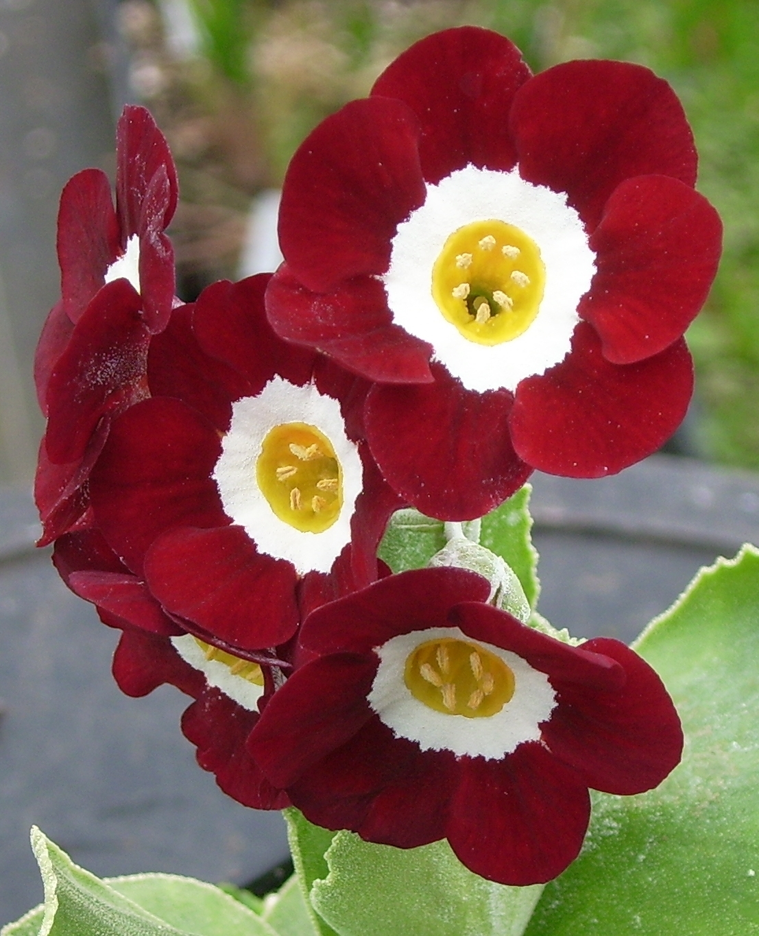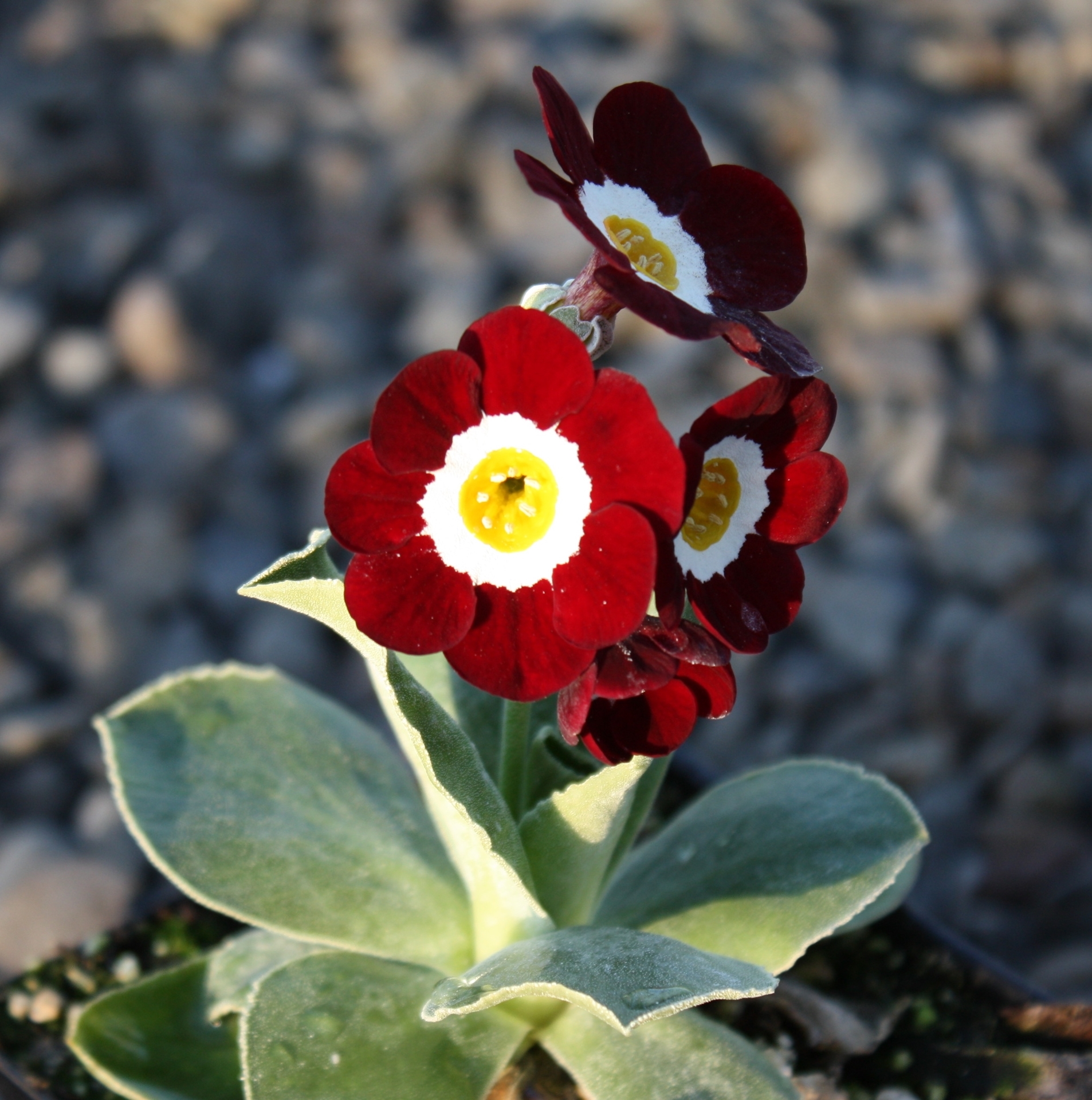 One just can't improve this one: perfect red, perfect white center and perfect flower shape. Although a show auricula, which usually shouldn't be exposed to rain avoiding the center to be washed out, we find 'Cortina' is holding very well up to the overhead irrigation. Grows in most well drained garden soils. Full sun is fine in higher elevation and/or cooler regions, otherwise needs a place without afternoon heat.