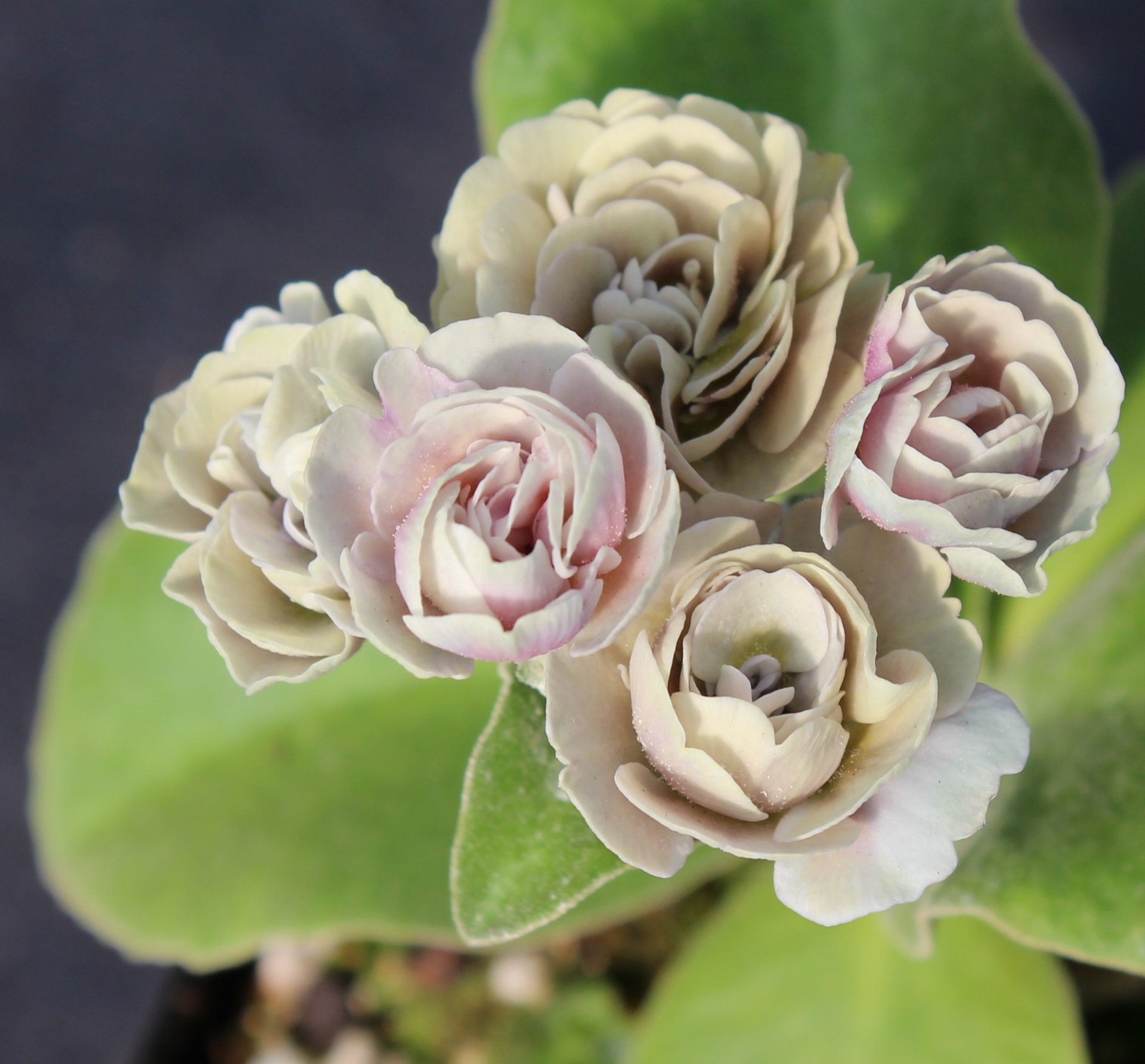 Fully double, opening to creamy-pink, turning silver white.