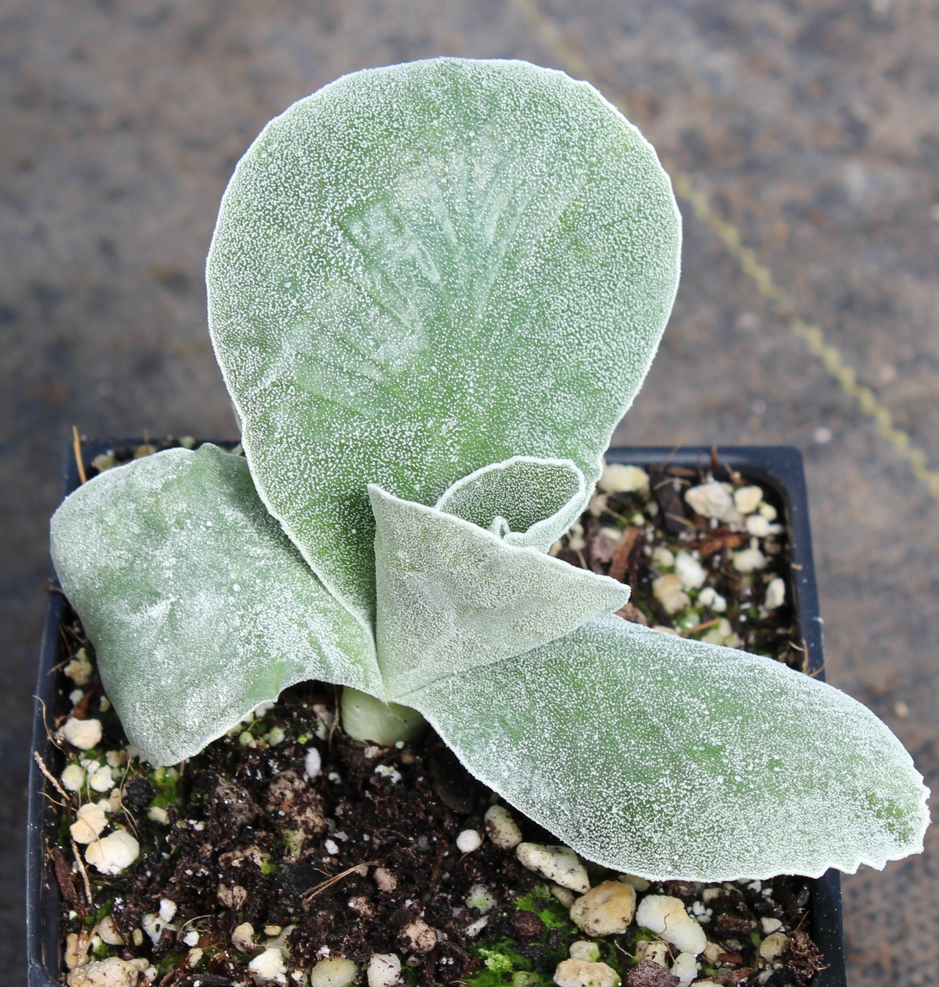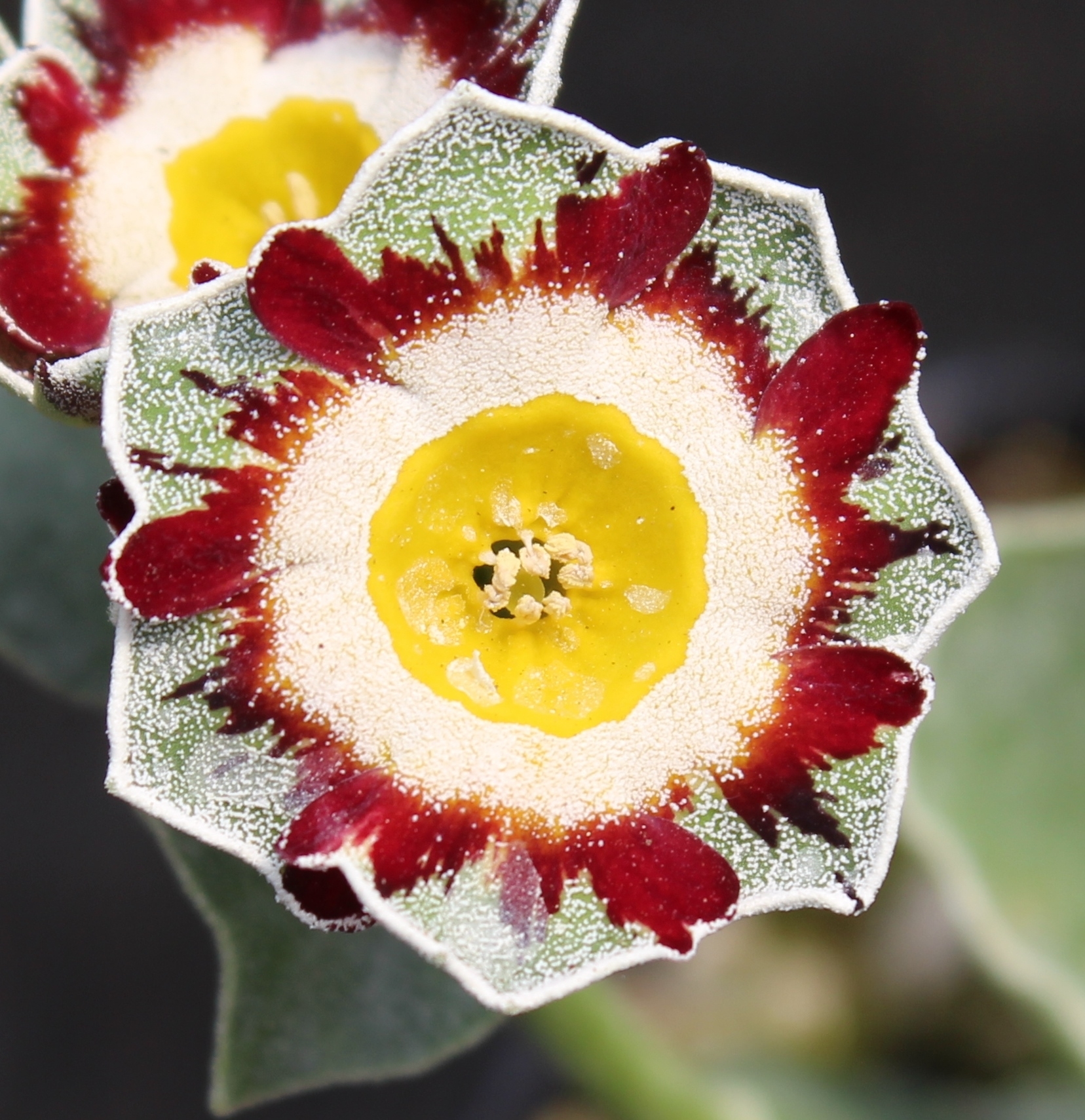 The leaves on this selection are a true masterpiece; large, roundish and covered with dots of farina (mealy substance) - rather than simply powdered with it. The flowers are deep velvety-red with green edge, which is also dotted with farina, along with the center. The very edge is again outlined with a solid line of farina. Grows in most well drained garden soils. Full sun is fine in higher elevation and/or cooler regions, otherwise needs a place without afternoon heat.