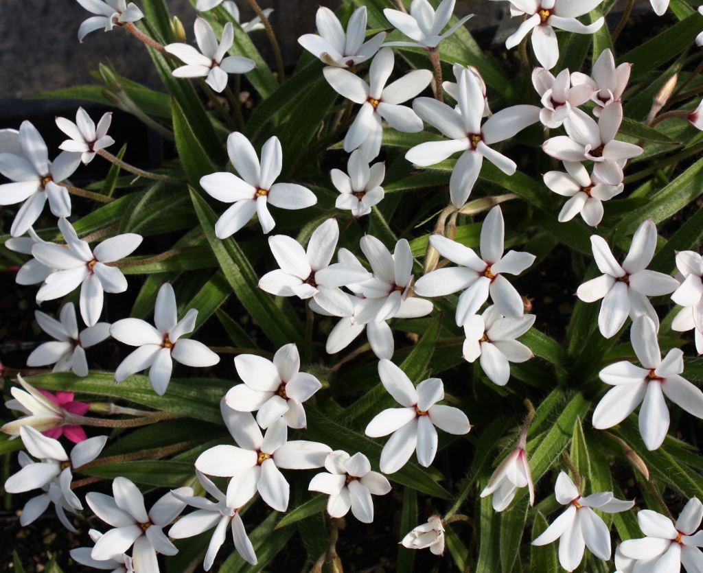 Simply too much TV! Large pure white flowers with red eyes. Needs well drained soil. In colder regions they can be grown easily in pots, which can be overwintered in a cool, dry room.