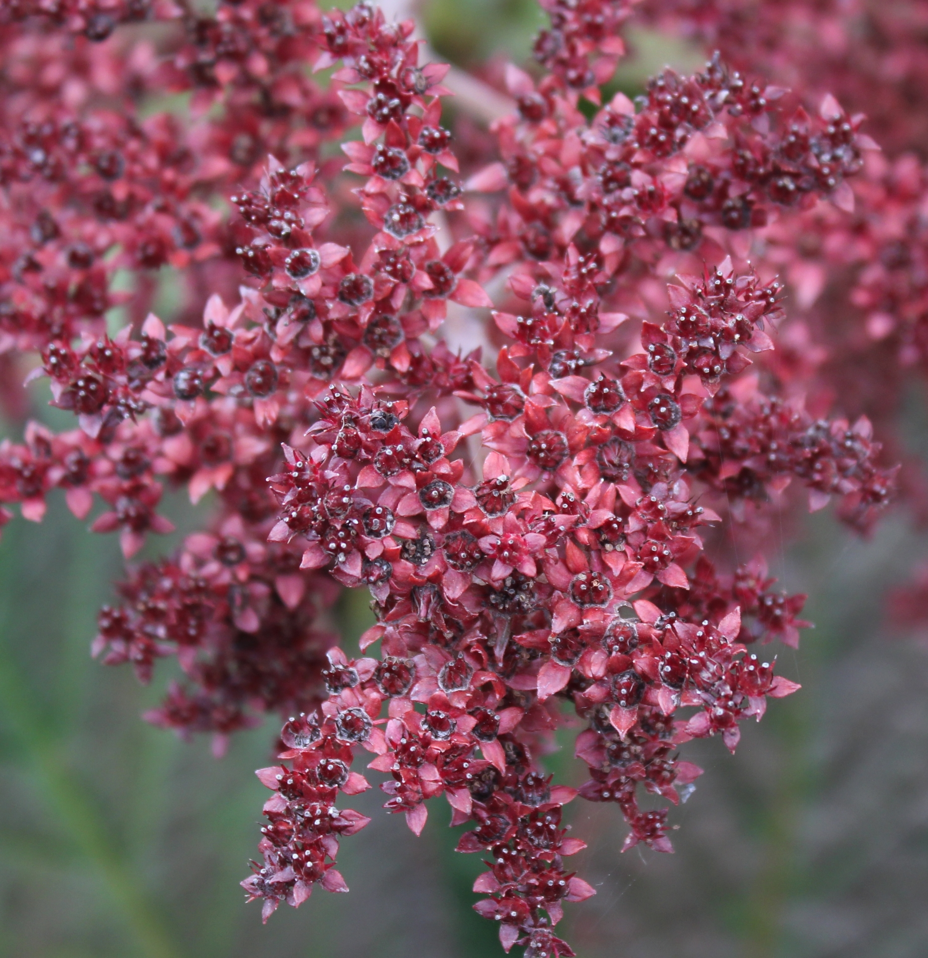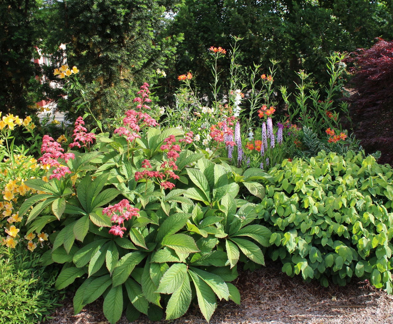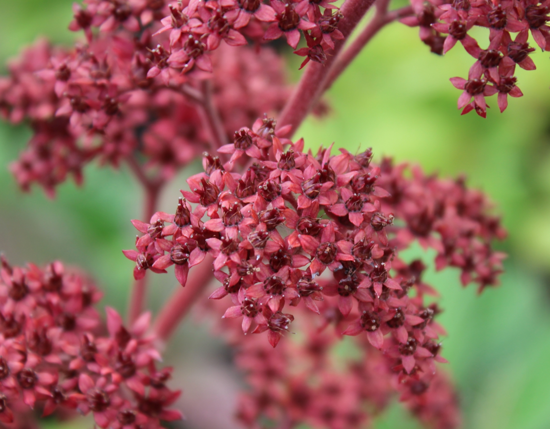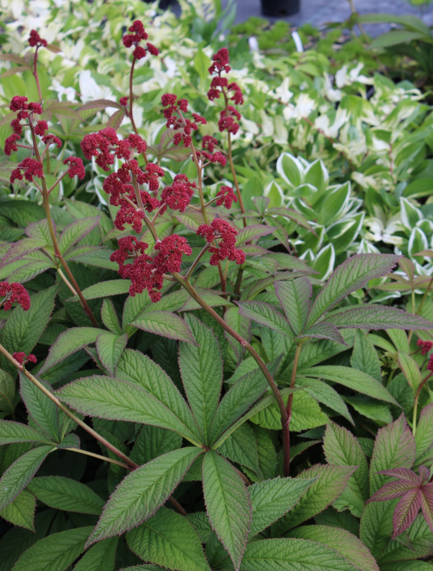 Rodgersias have been introduced to gardens mainly for their attractive foliage, reminiscent of horse chestnut. This selection from Crug Farm, England, sports large panicles (branched flower stems) of pink starry flowers, which open from ruby-red buds and turn eventually into a dark cardinal-red - hence the name.