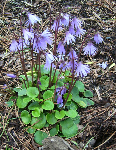 One of my absolute favorites growing up, seeing them on our hikes in the Alps. They often can be spotted blooming right on the edge of where the snow has melted away, hence the common name. This not so obvious primrose relative has delicate, heavily fringed violet bells. The dark green leaves are round, shiny and leathery. Does best in well drained but moist soils, cool sun to half shade.