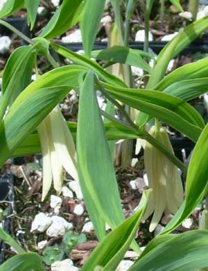 A very showy selection of this East Coast native, with bright green leaves edged in gold, on wiry stems. Pale yellow, bell-shaped flowers appear on the tip of the stems.