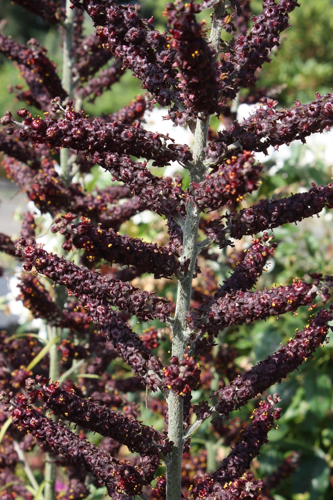 Much sought after, producing 12" long and 6" wide, pleated leaves. On imposing panicles are countless (over 1000 on mature plants) star-shaped, dark maroon flowers, 1/2" across each. They normally bloom in the 7th to 8th year, this ones are 4-5 years old. Average to moist soil; best in moist, especially in sun.